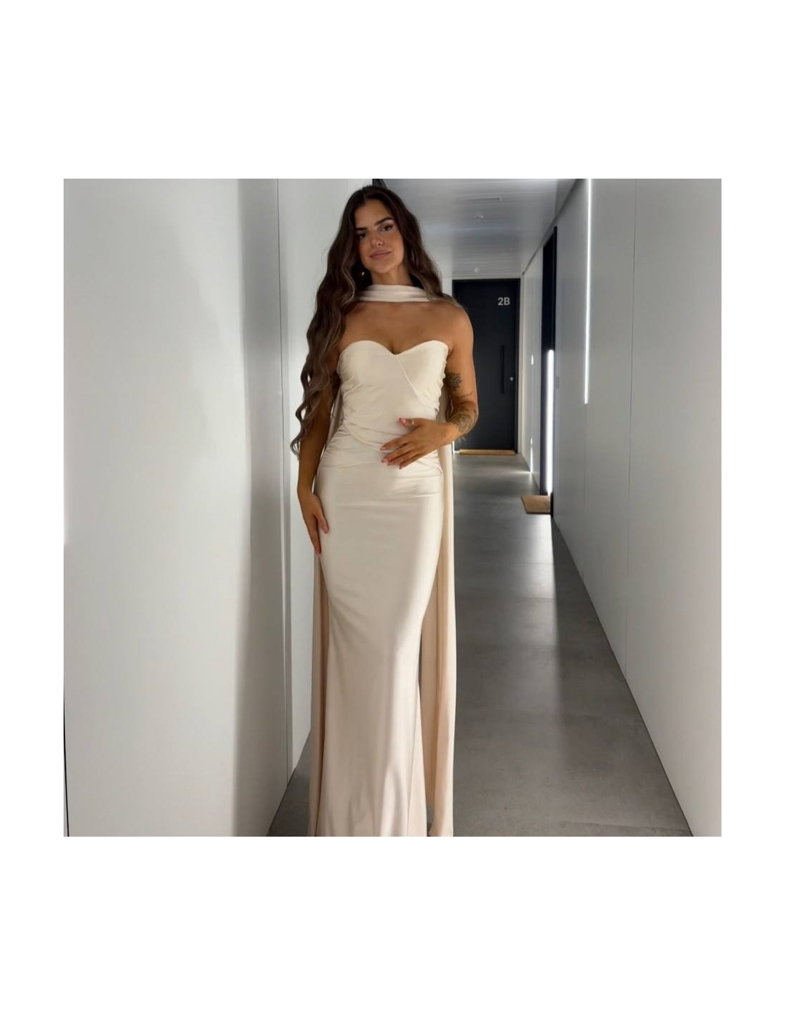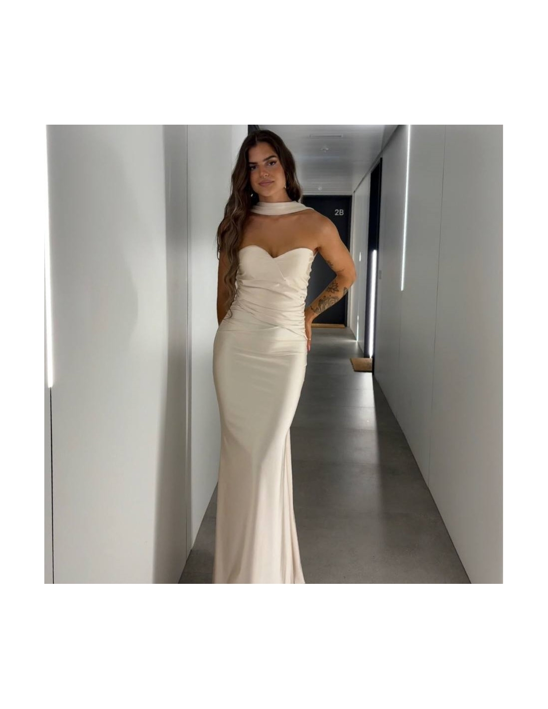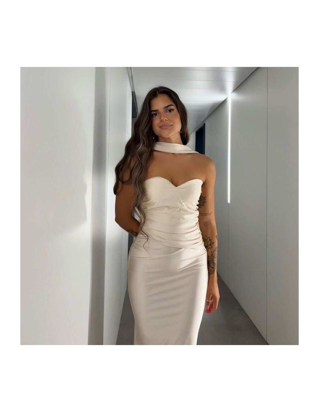 Vestido gargantilla de palabra de honor. Fruncido delantero. Talla única.