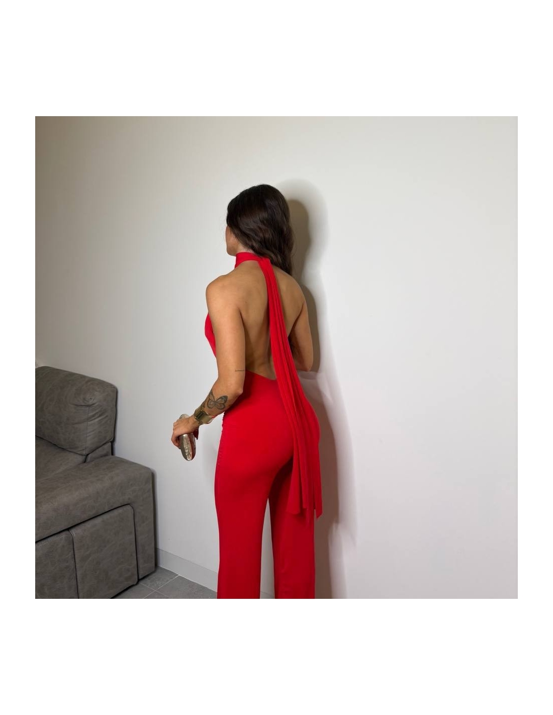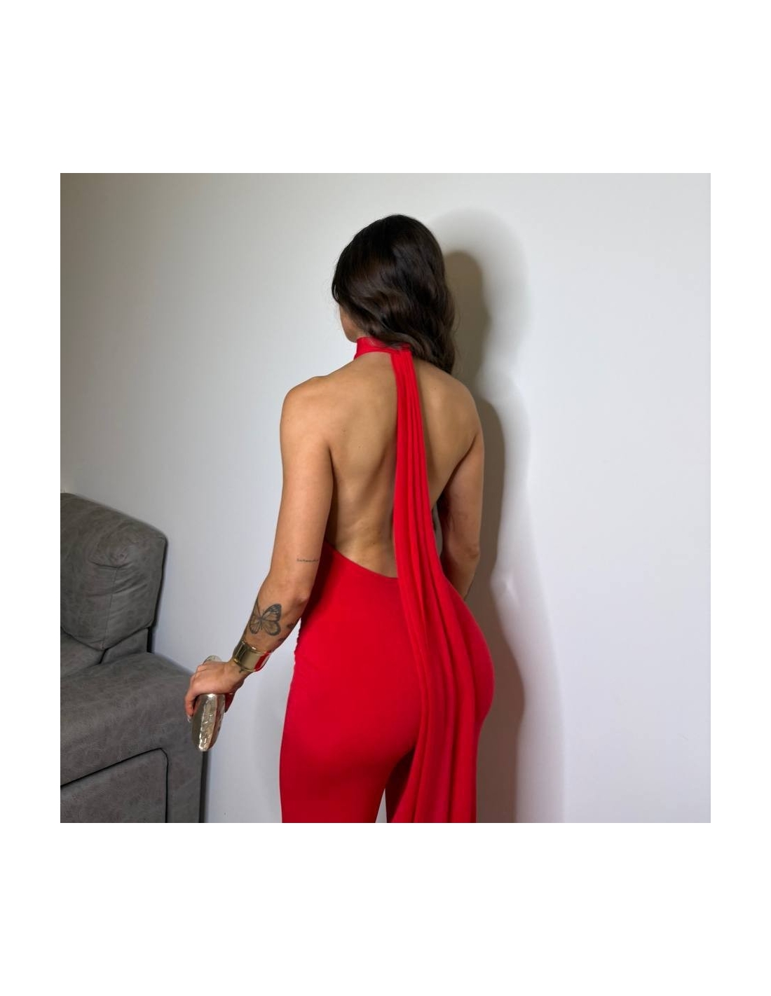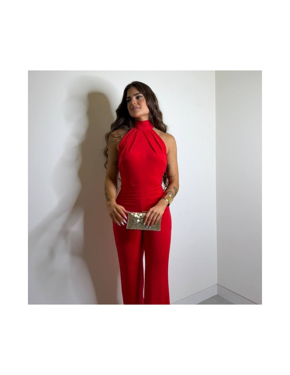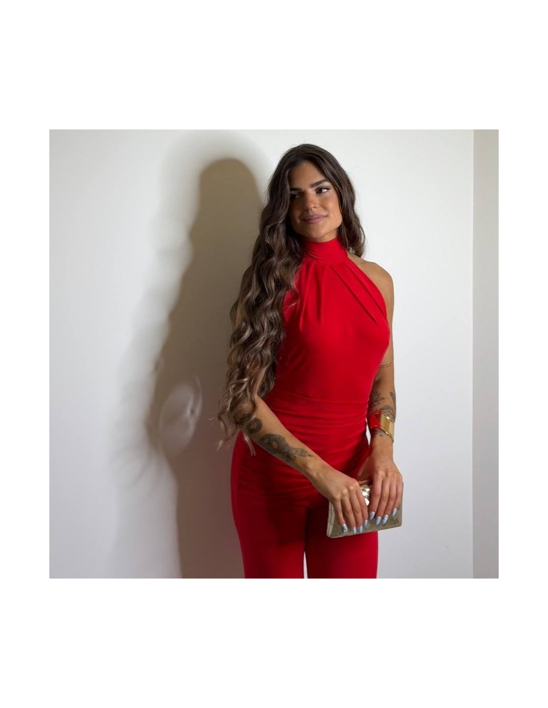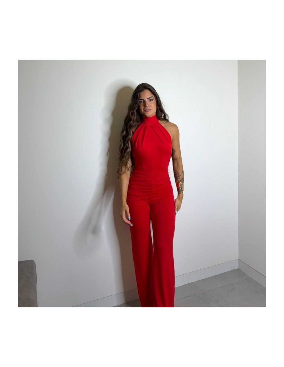 Mono halter regulable al cuello con lazada a tono. De campana. Fruncido en parte delantera. Elástico. Talla única