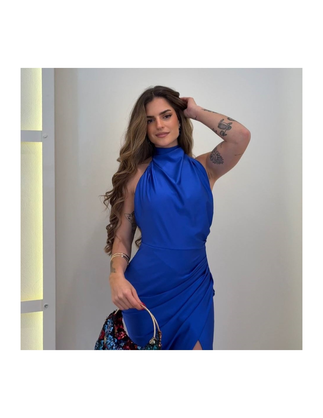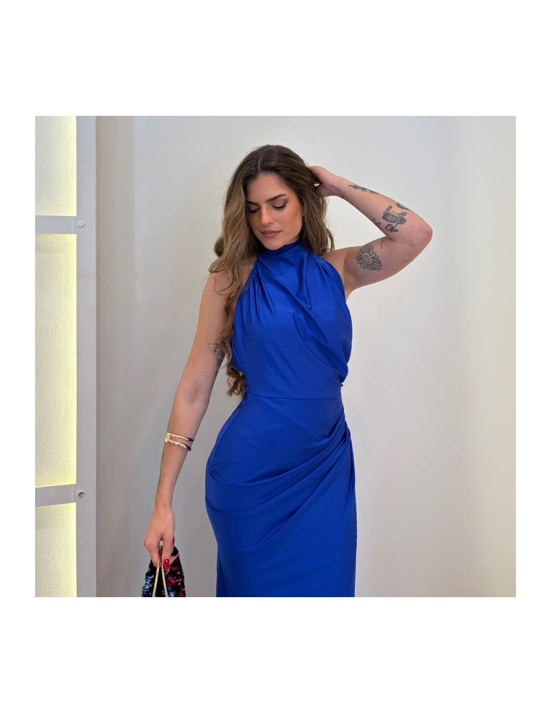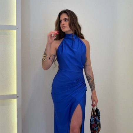 Vestido halter largo. Fruncido en parte delantera. Cierre trasero con cremallera oculta. Talla única