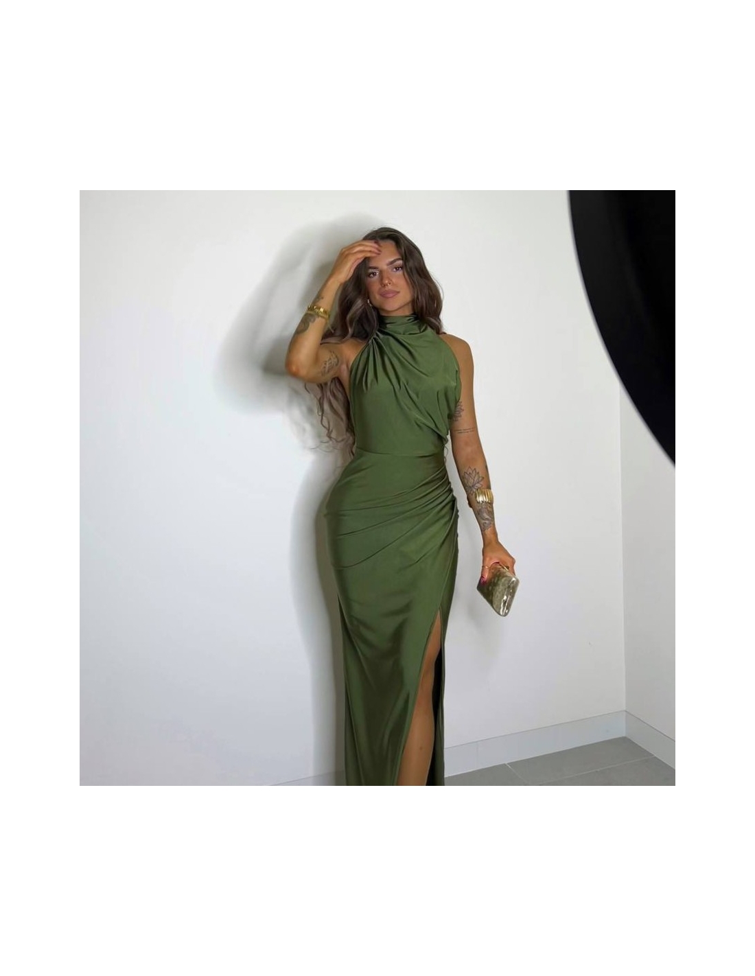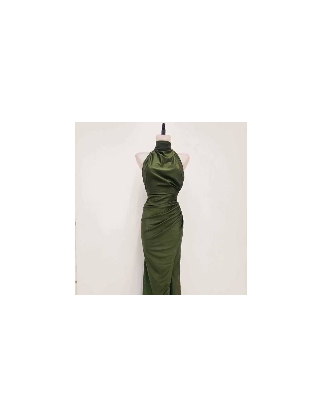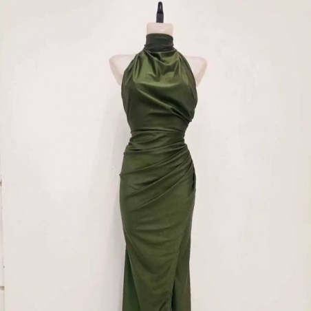 Vestido halter largo. Fruncido en parte delantera. Cierre trasero con cremallera oculta. Talla única