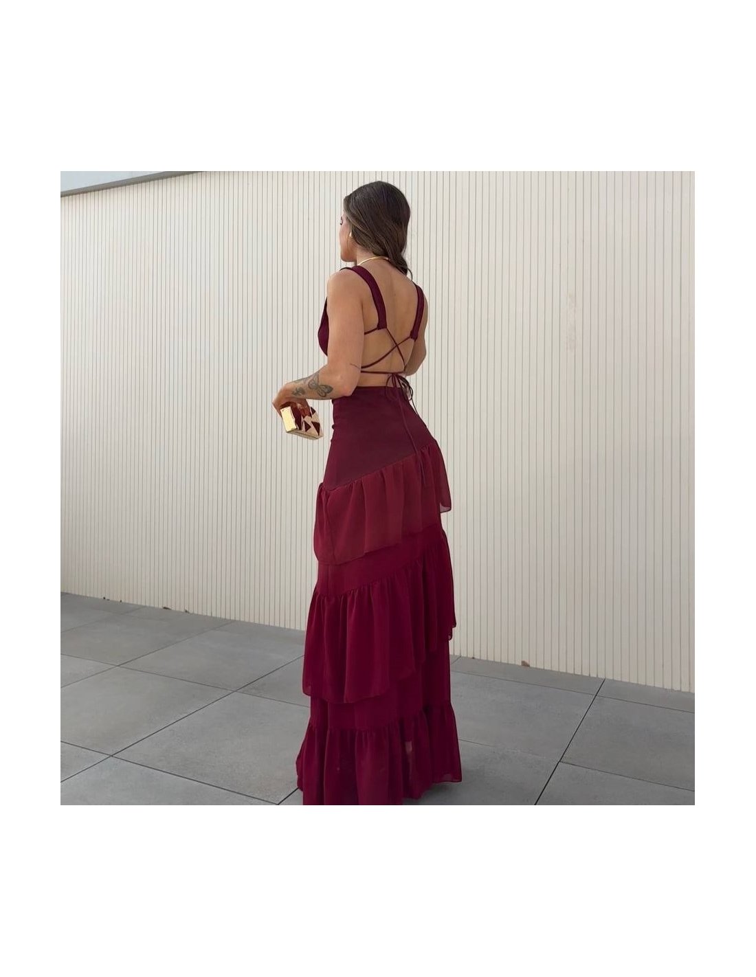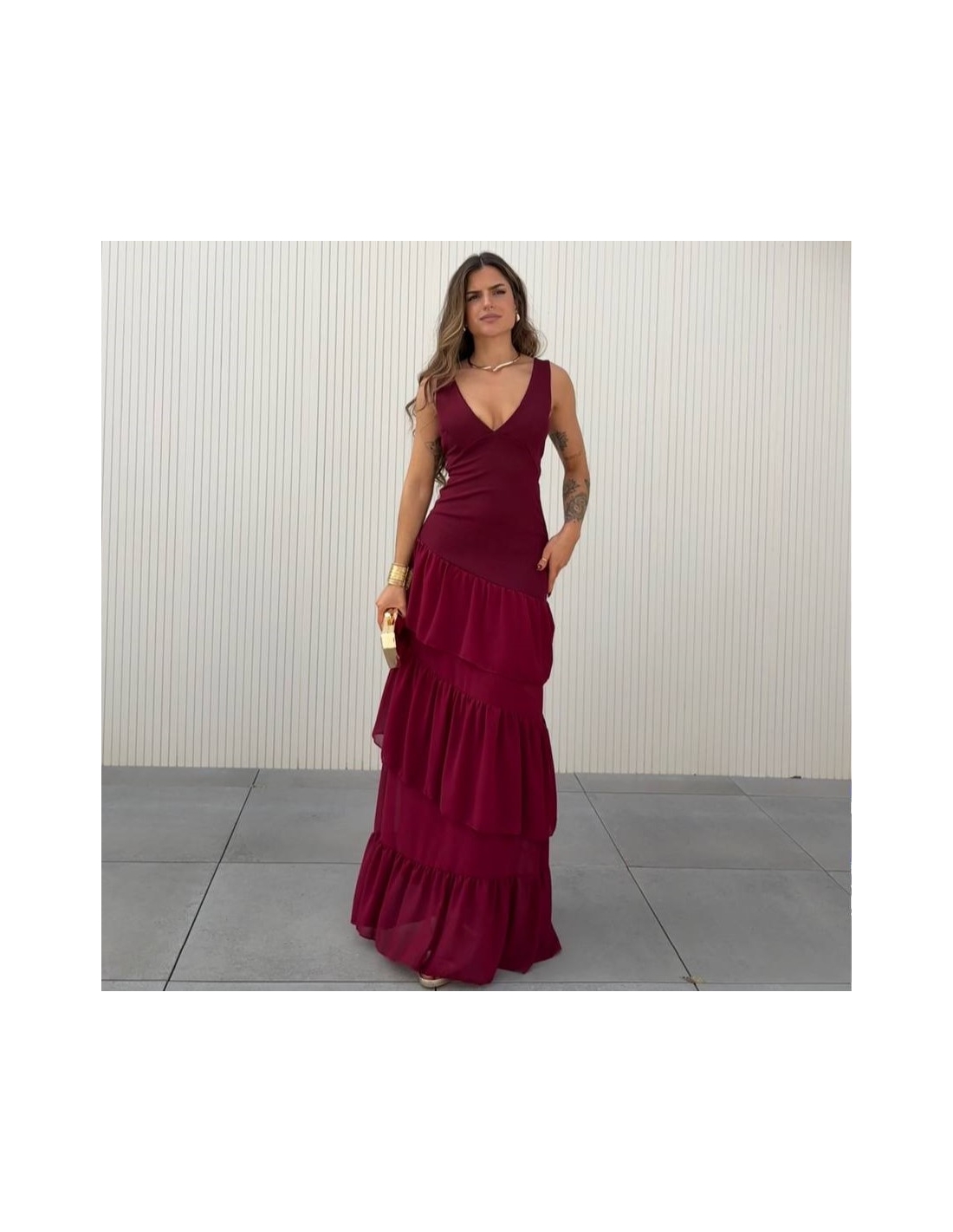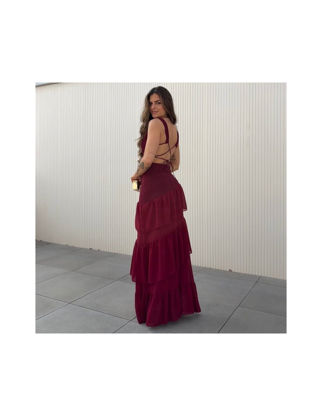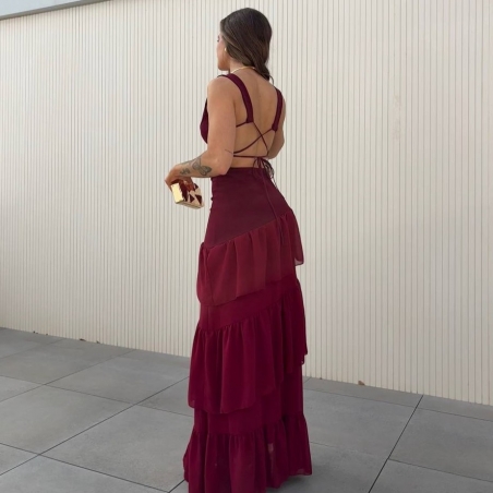 VESTIDO ESPALDA CRUZADA VOLANTES VINO