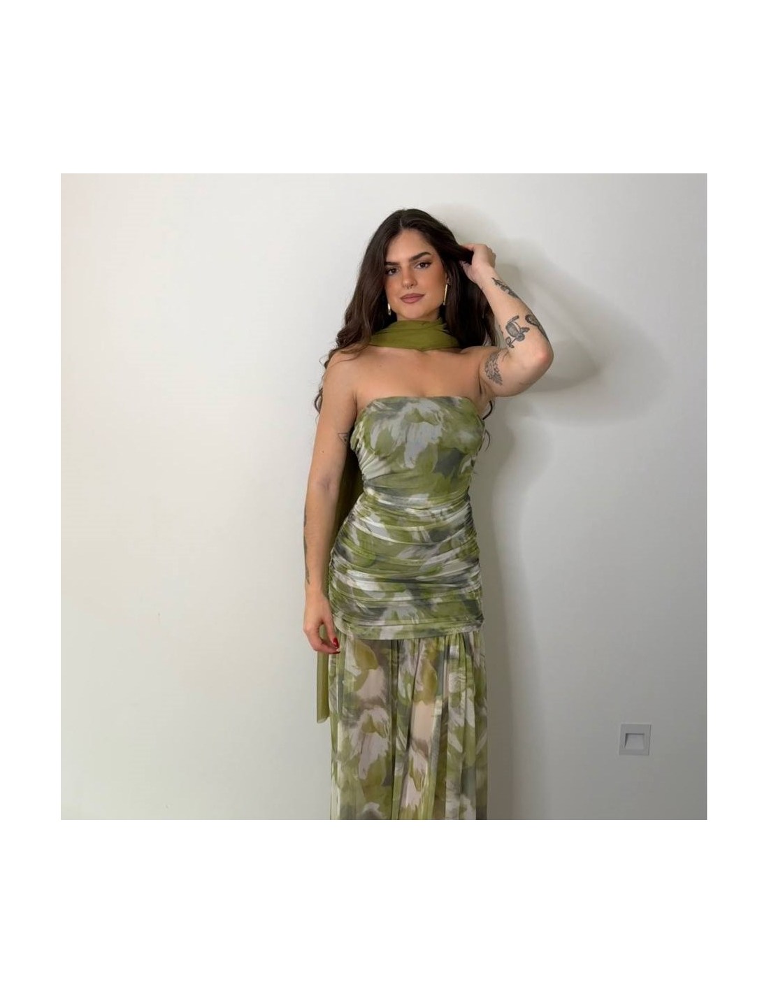 Vestido evento largo de tul estampado. Posibilidad de usar con tirantas finas regulables a tono. Fruncido. Talla única