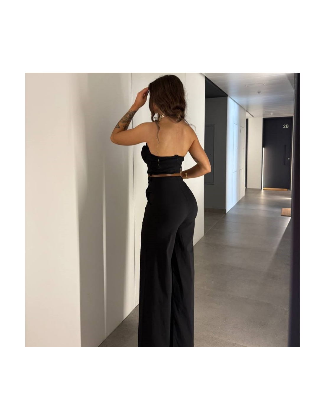 Mono escote v con cinturón incluído. Cremallera trasera oculta. Corte recto. Talla única.