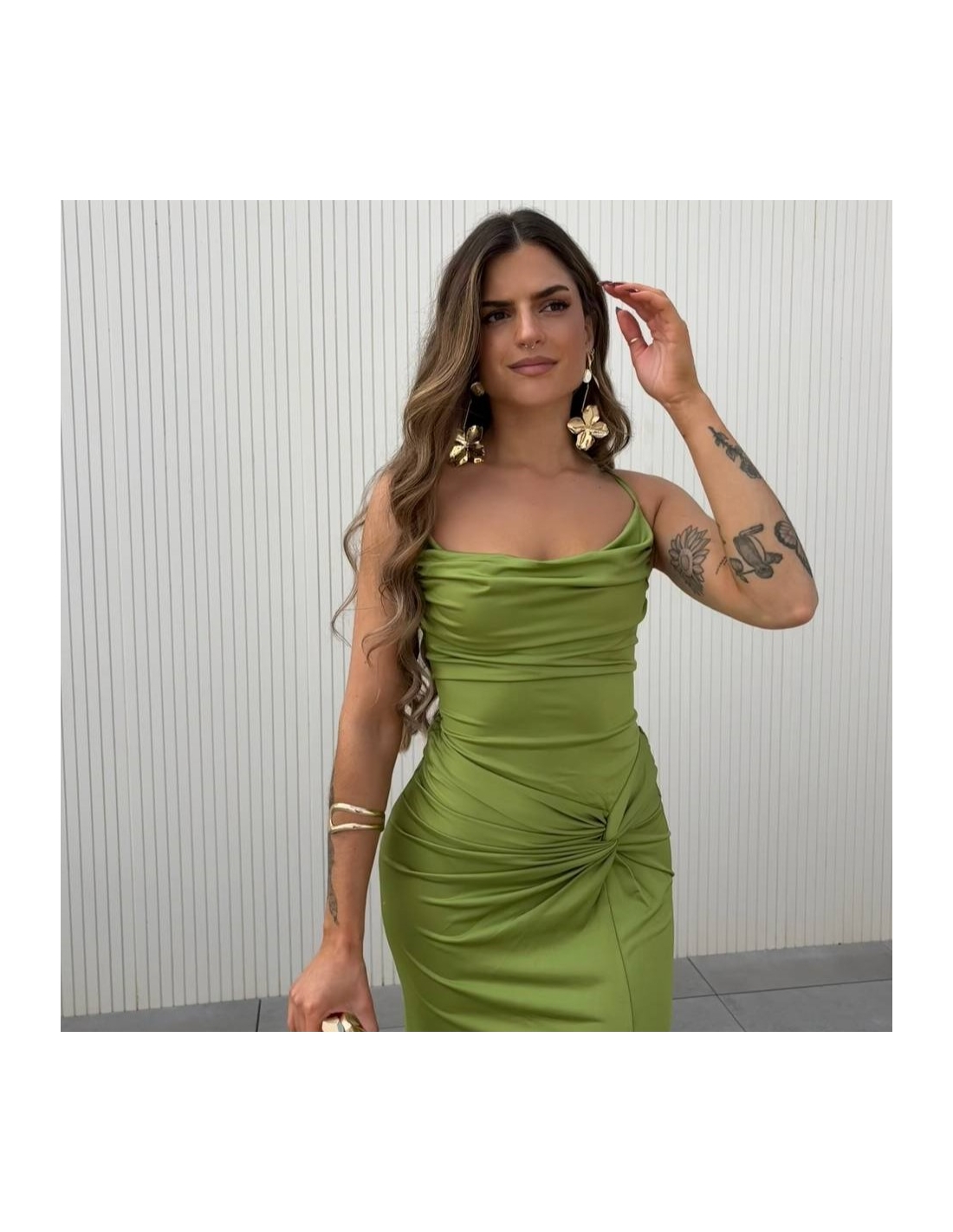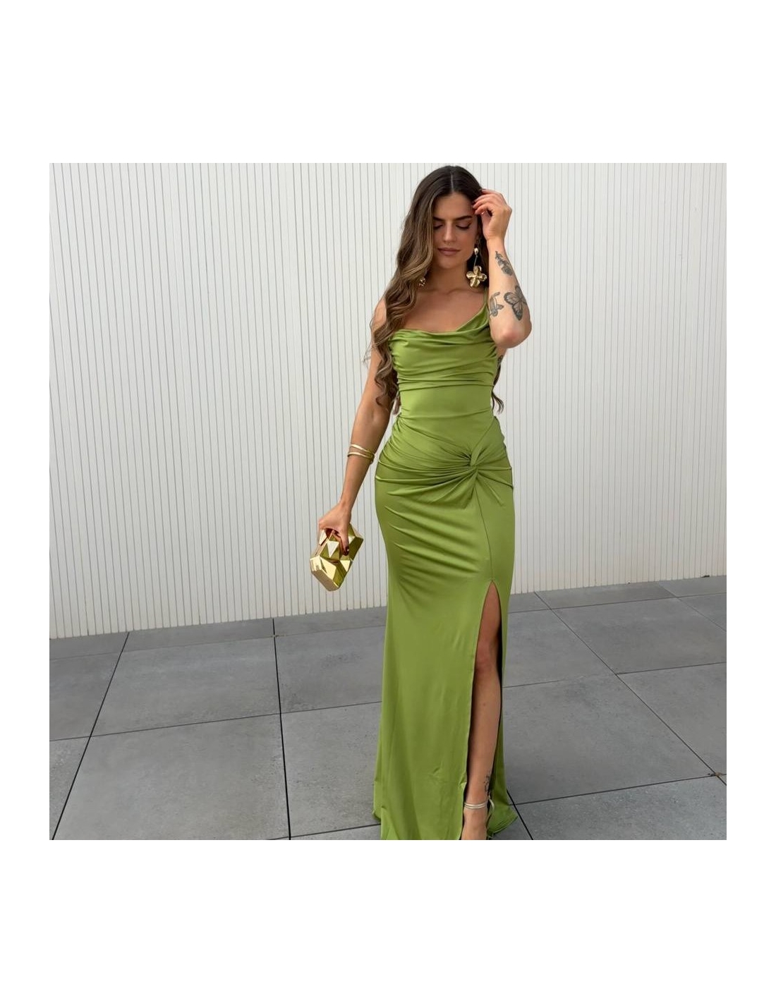 Vestido gala. Fruncido y nudo delantero. Tejido grueso muy elástico. Tiranta fina a tono unida a espalda cruzada regulable. Fruncido trasero. Talla única.