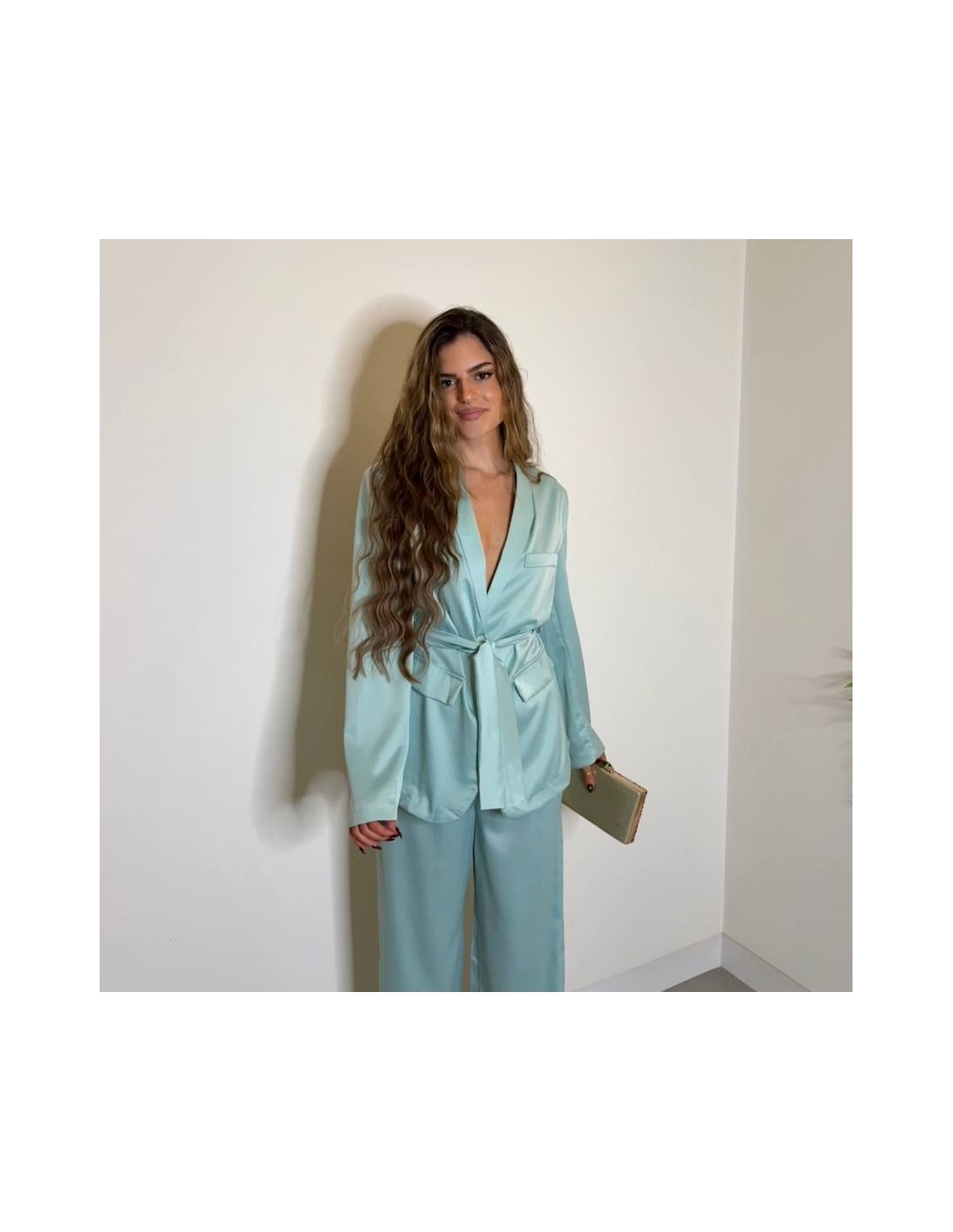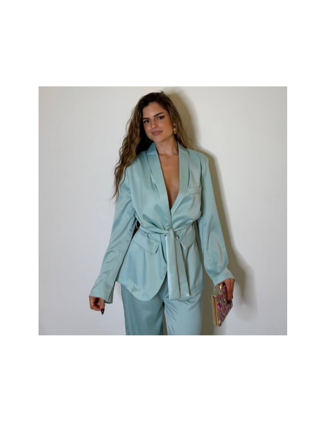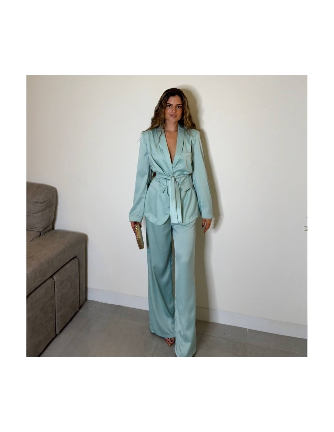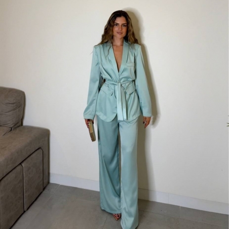 Conjunto traje satén de blazer forrada en su interior con hombreras + pantalón de tiro alto y cintura elástica recto y acampanado. Lazada regulable a la cintura y cierre con botón delantero. Calidad ++++++++