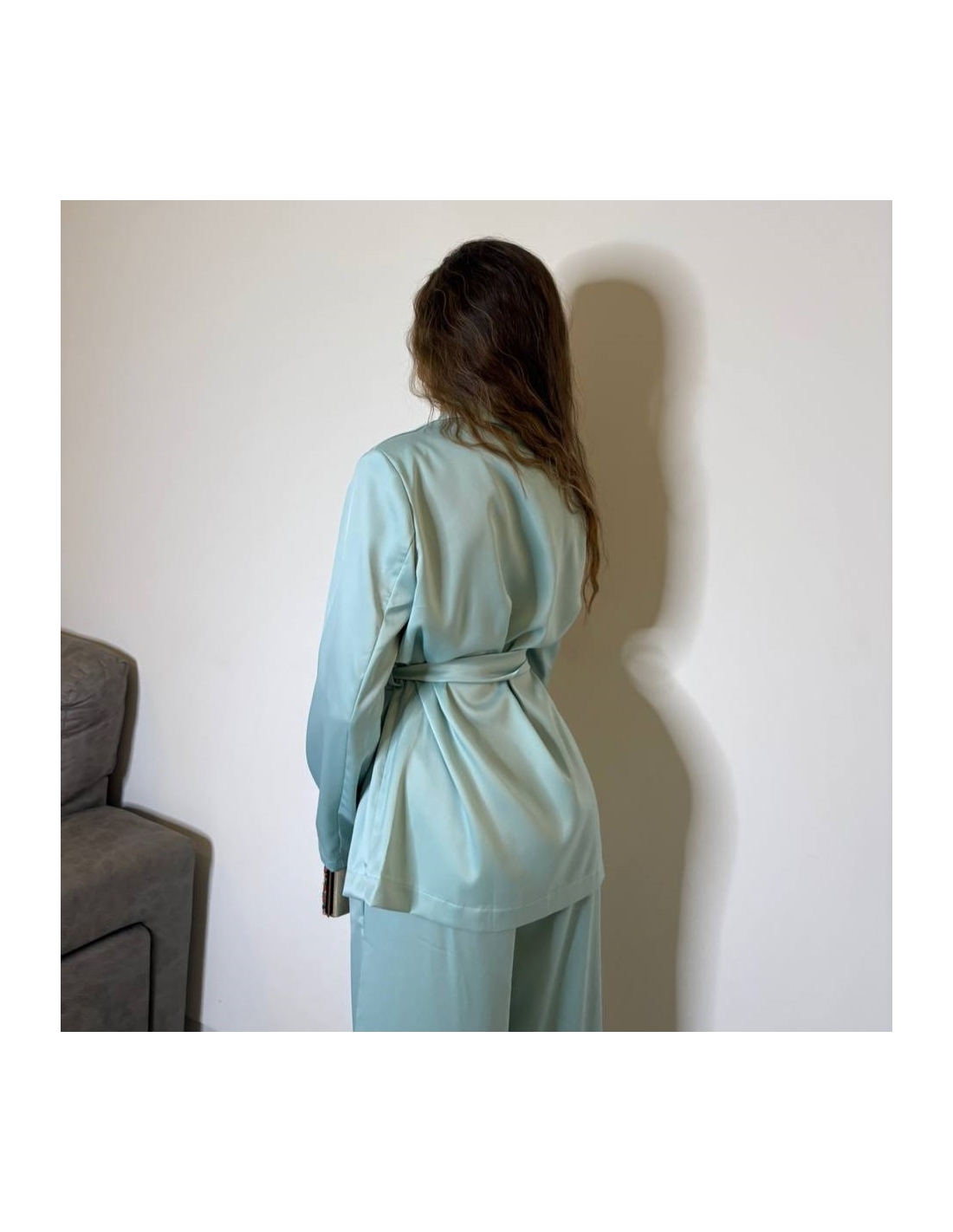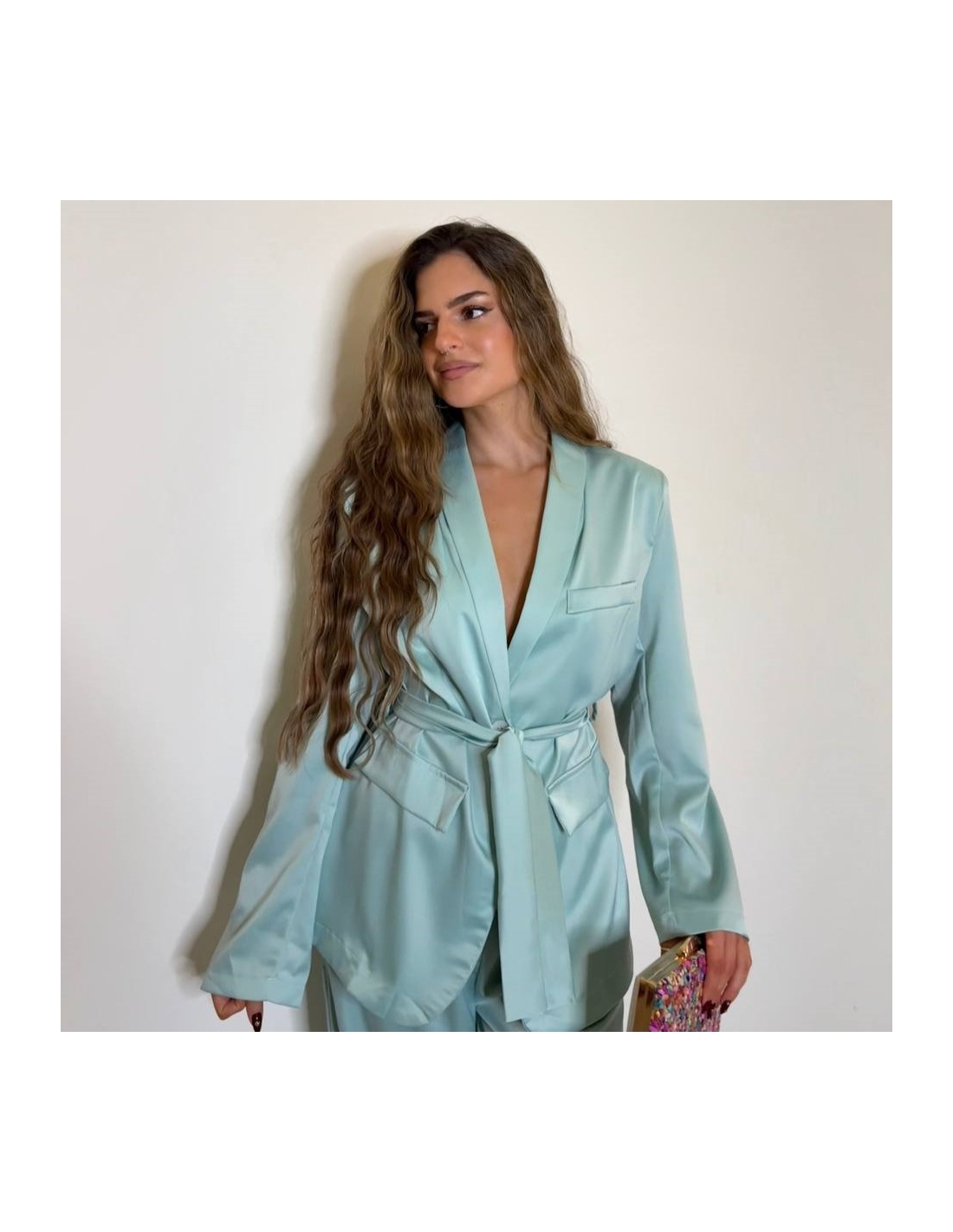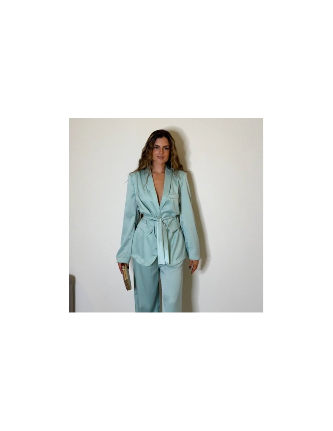 Conjunto traje satén de blazer forrada en su interior con hombreras + pantalón de tiro alto y cintura elástica recto y acampanado. Lazada regulable a la cintura y cierre con botón delantero. Calidad ++++++++