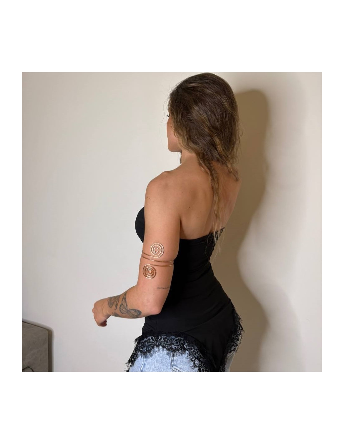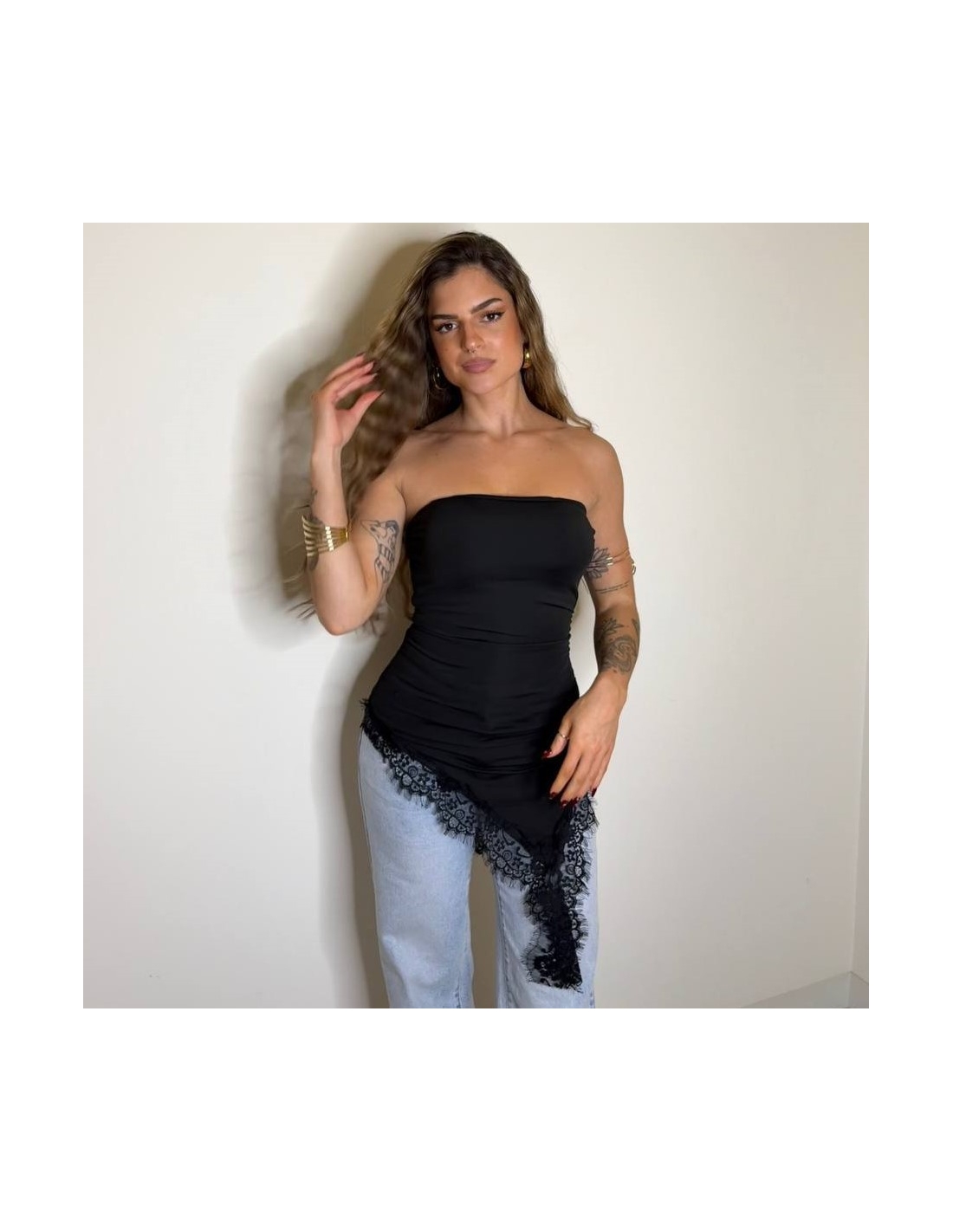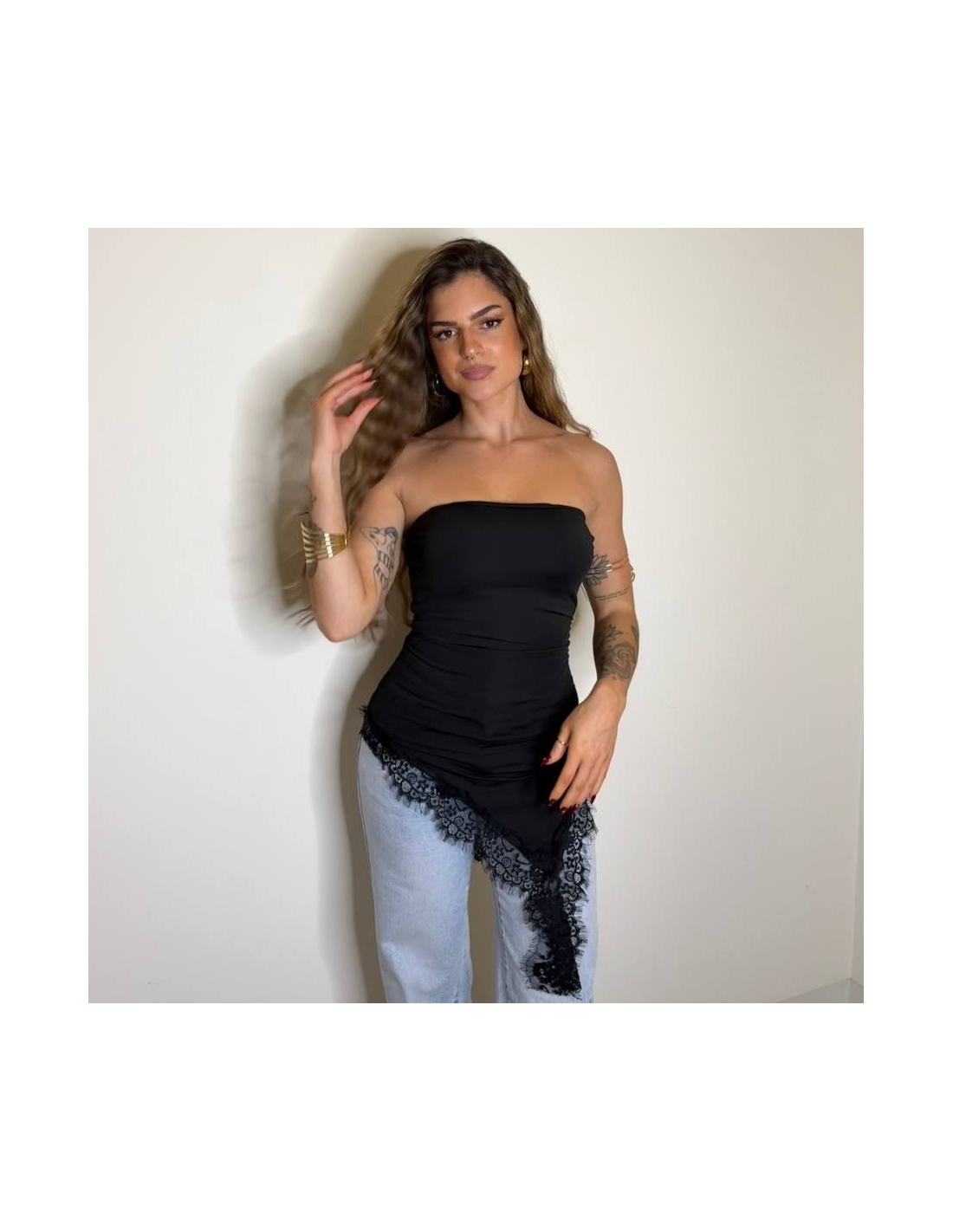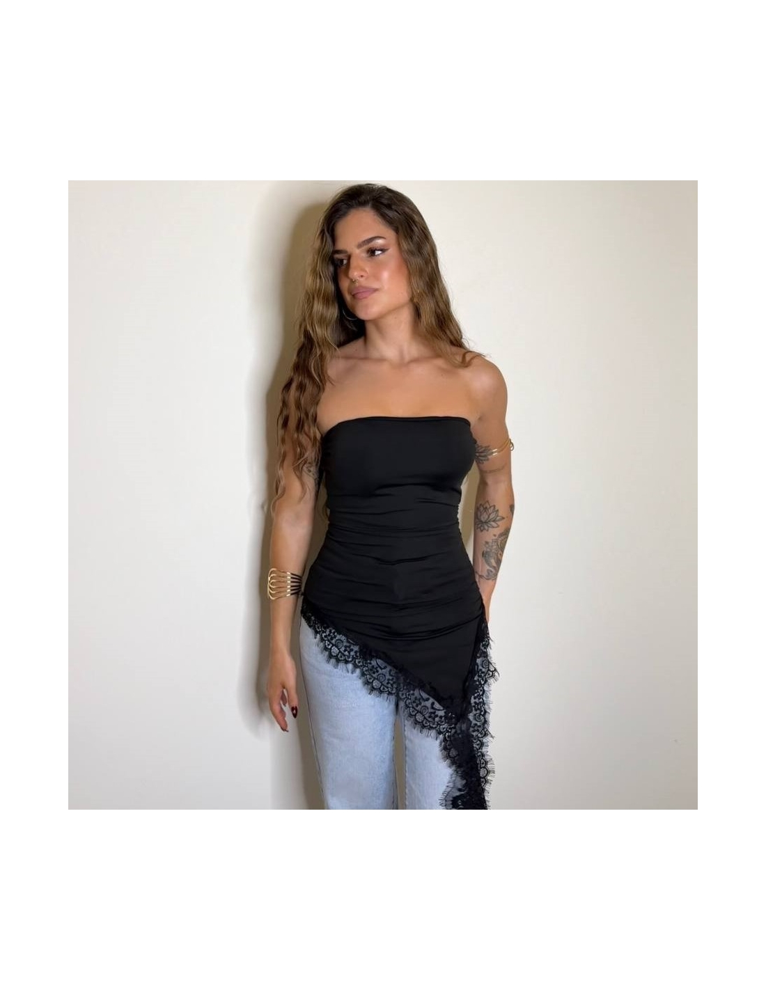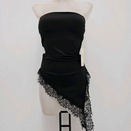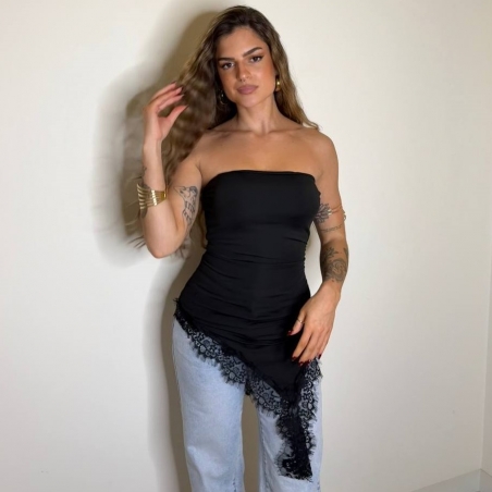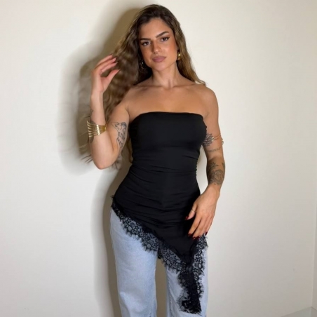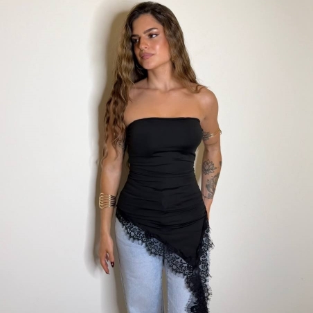 Top de palabra de honor con bajo de encaje asimétrico. Cascos incorporados. Tejido doble licra. Talla única.