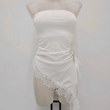 Top de palabra de honor con bajo de encaje asimétrico. Cascos incorporados. Tejido doble licra. Talla única.