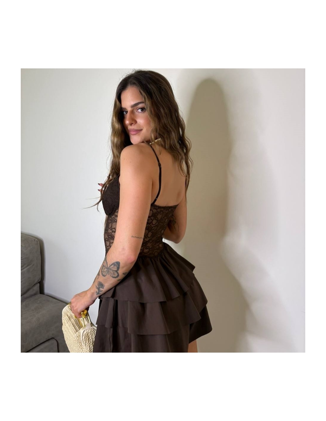 MONO CORTO VOLANTES ENCAJE CHOCO
