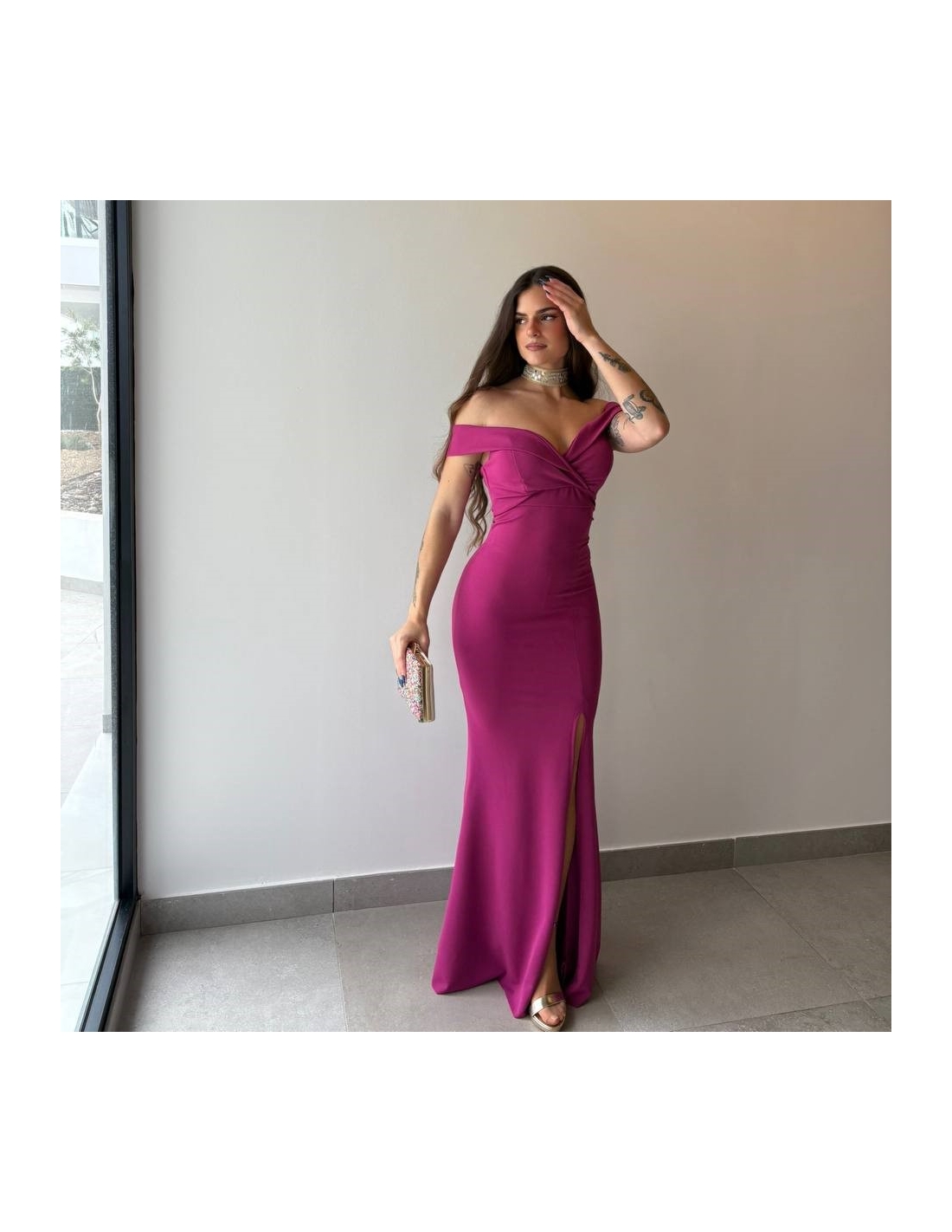 Vestido evento escote barco largo. Cierre trasero con cremallera. Abertura delantera central. Con casco incorporado. Talla única