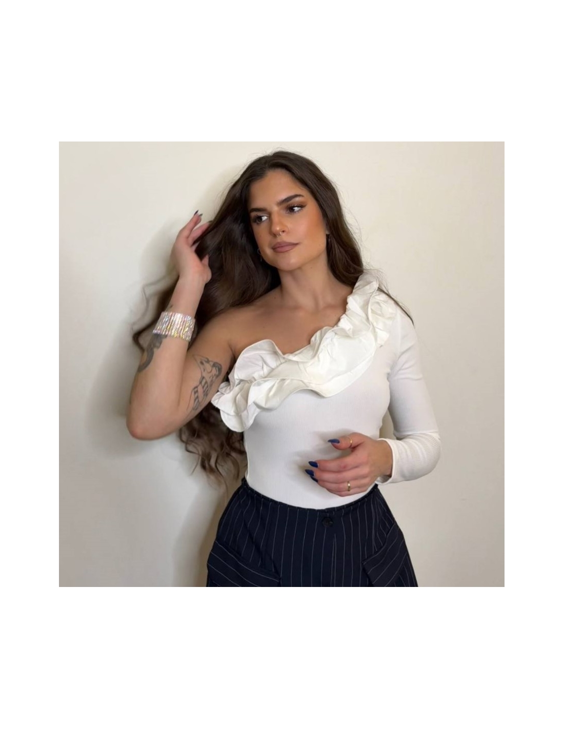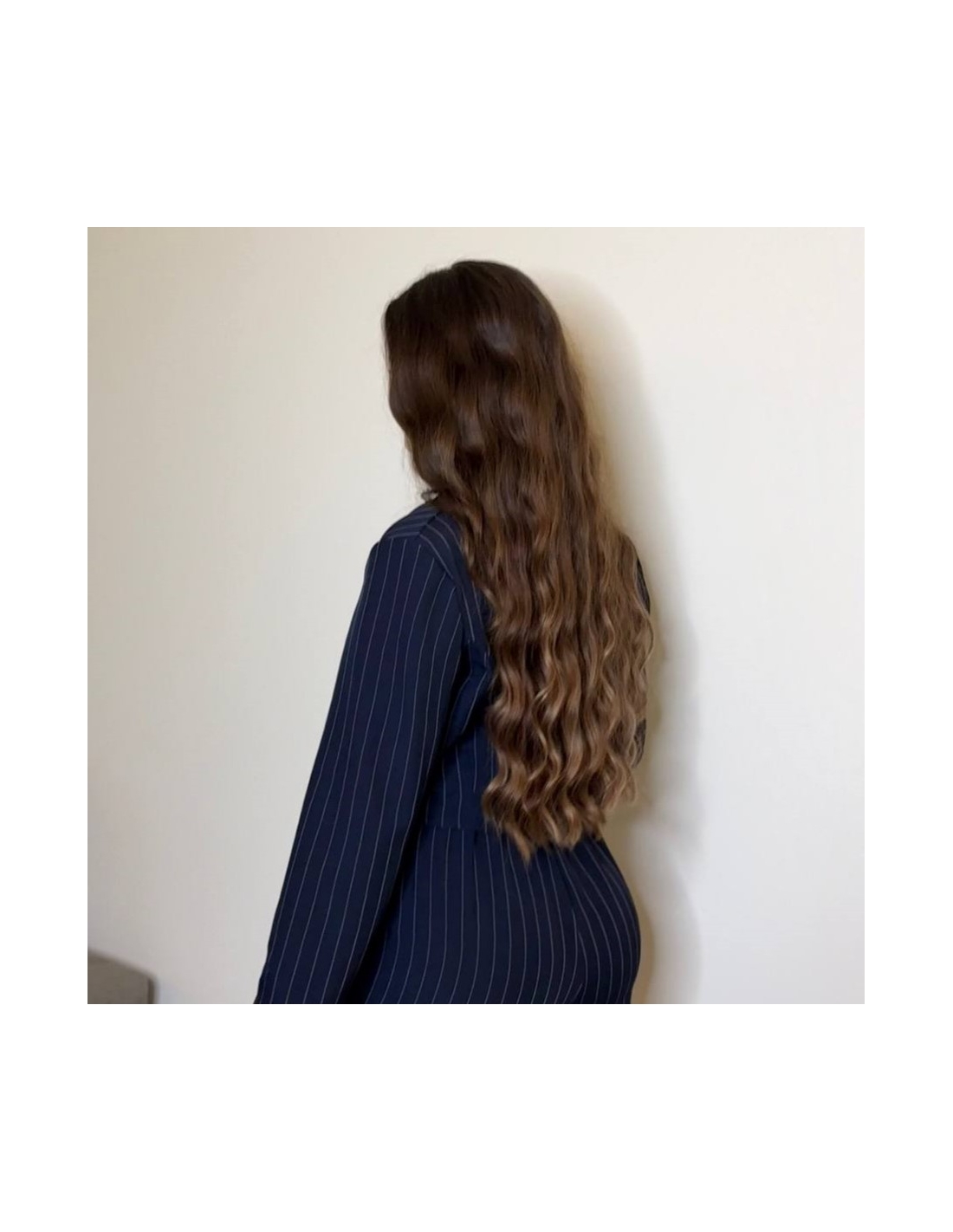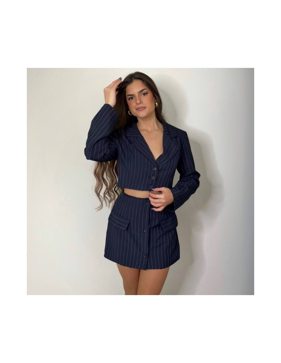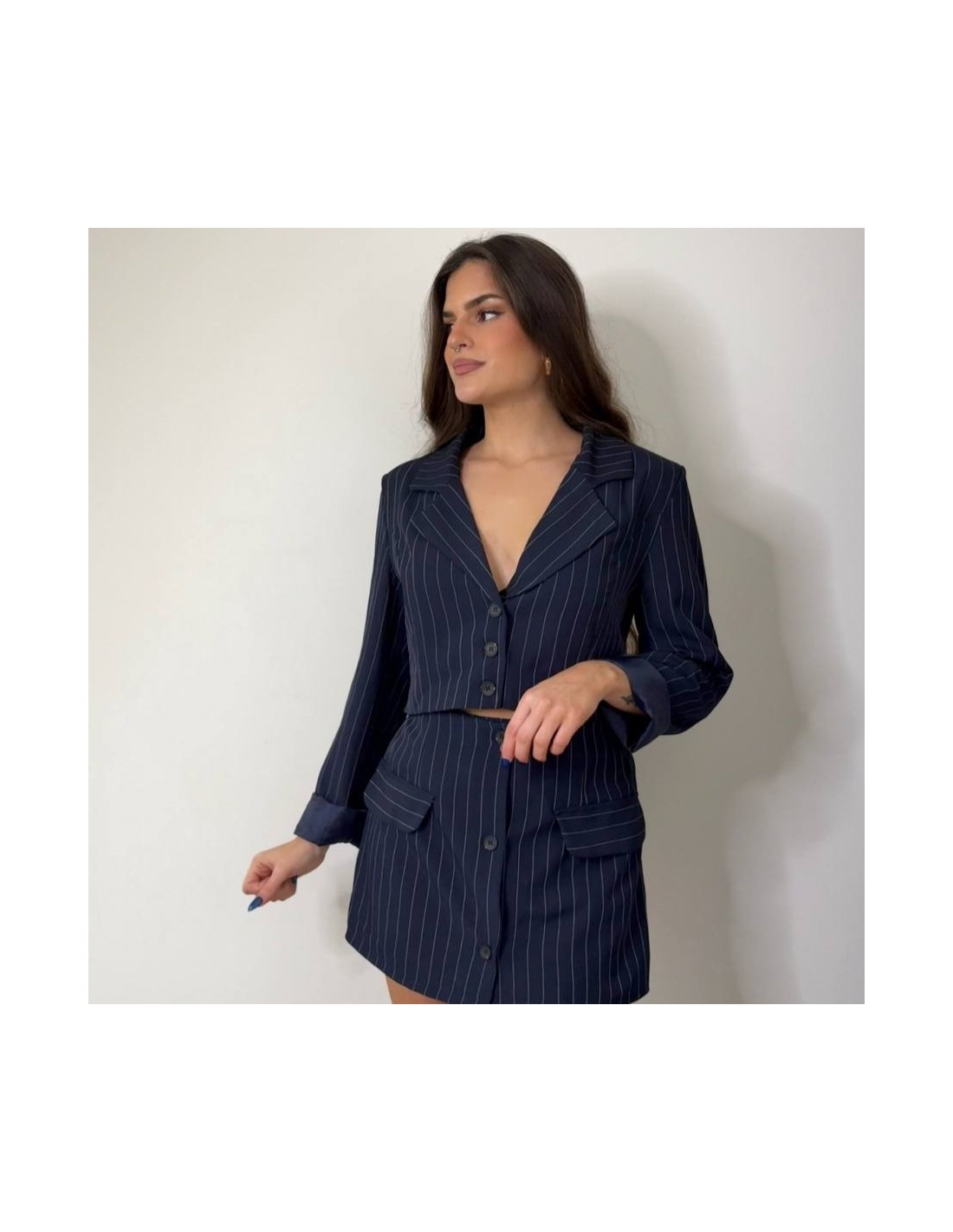 Conjunto traje rayas blazer cropped abotonada + falda pantalón. Forro interior. Talla única.