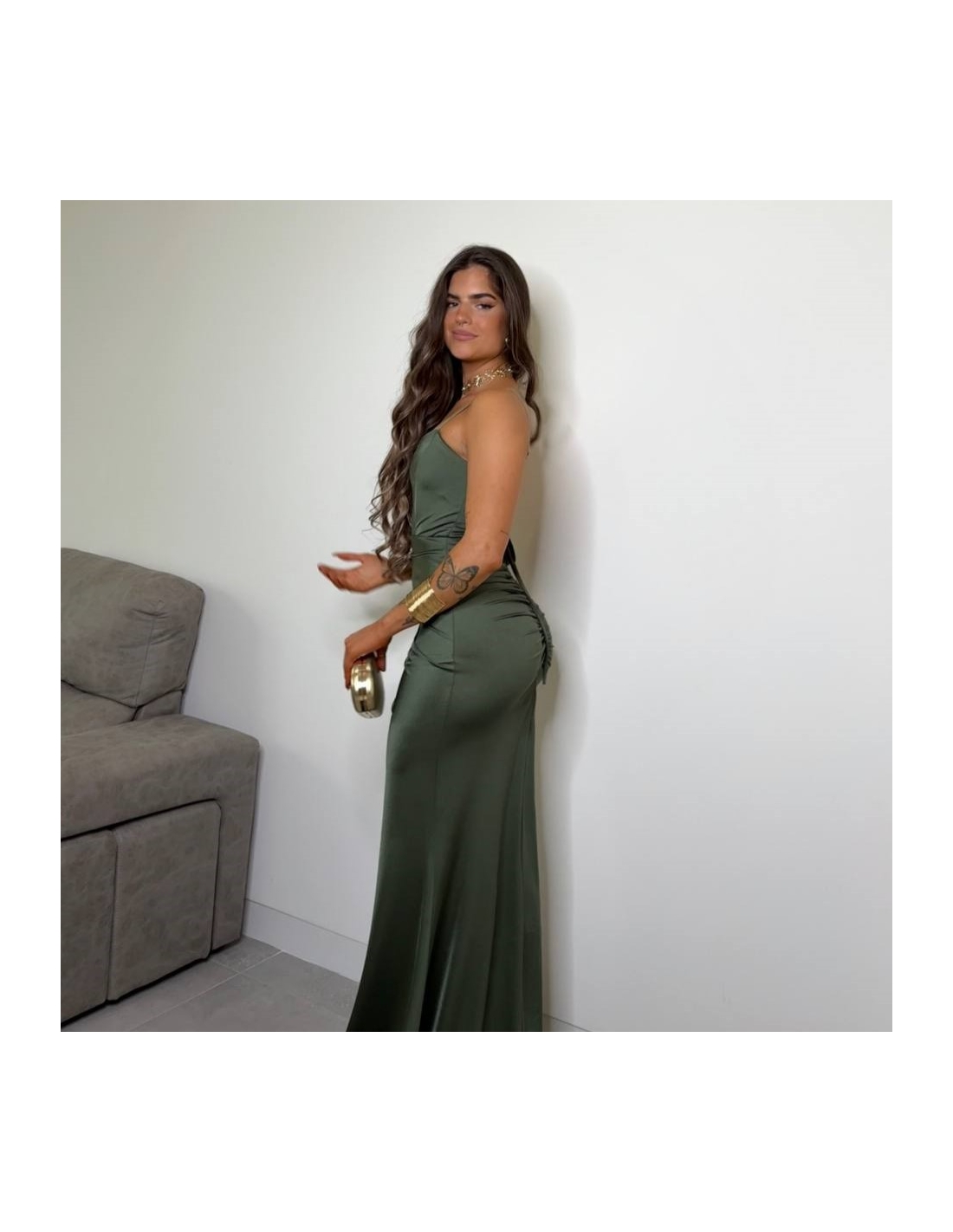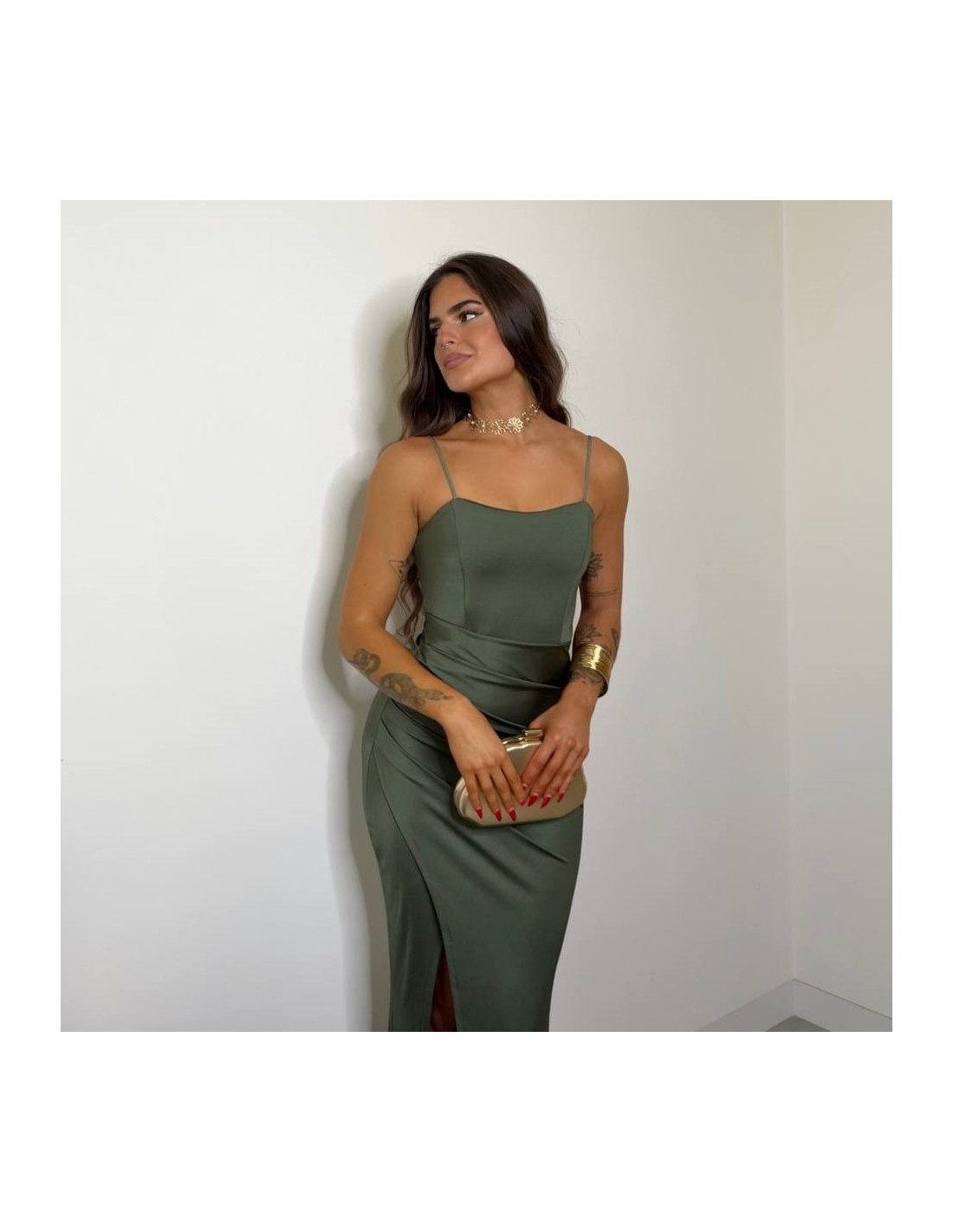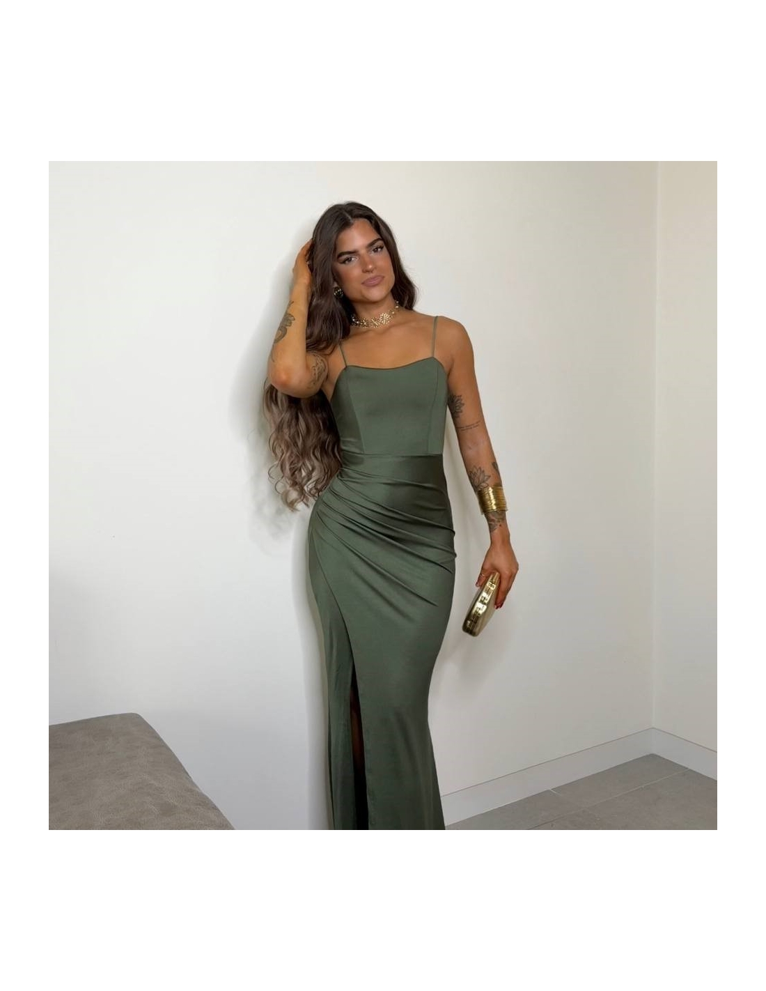 Vestido evento largo en tono verde caqui. Espalda cruzada regulable. Fruncido en parte delantera con fruncido. Elástico. Talla única