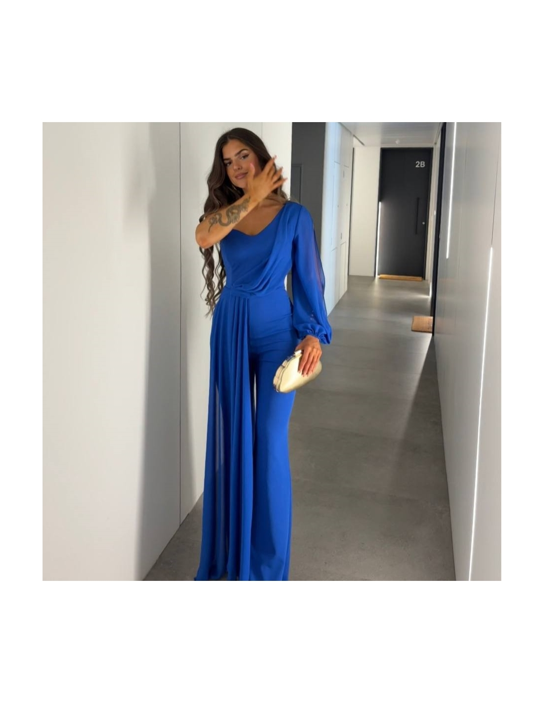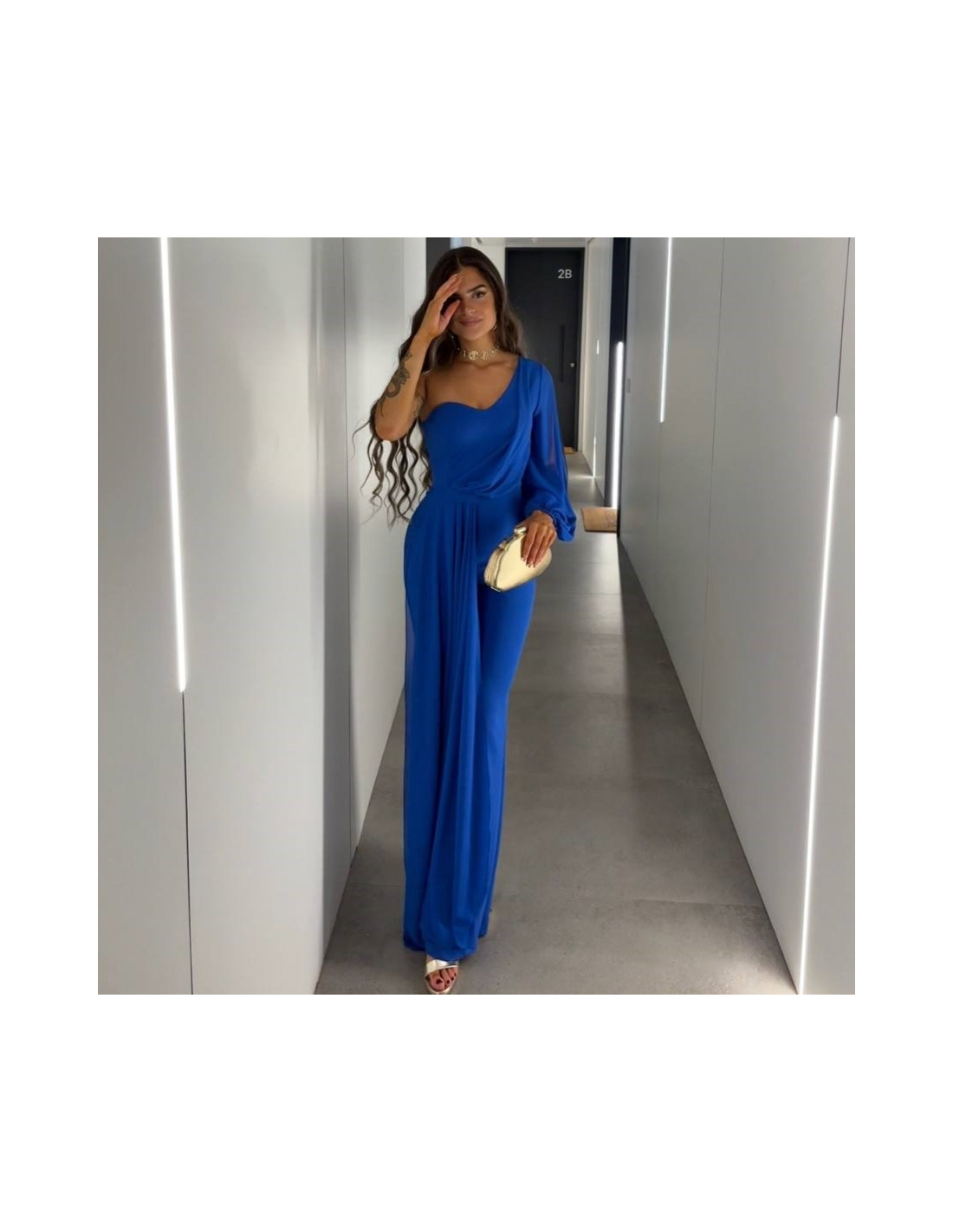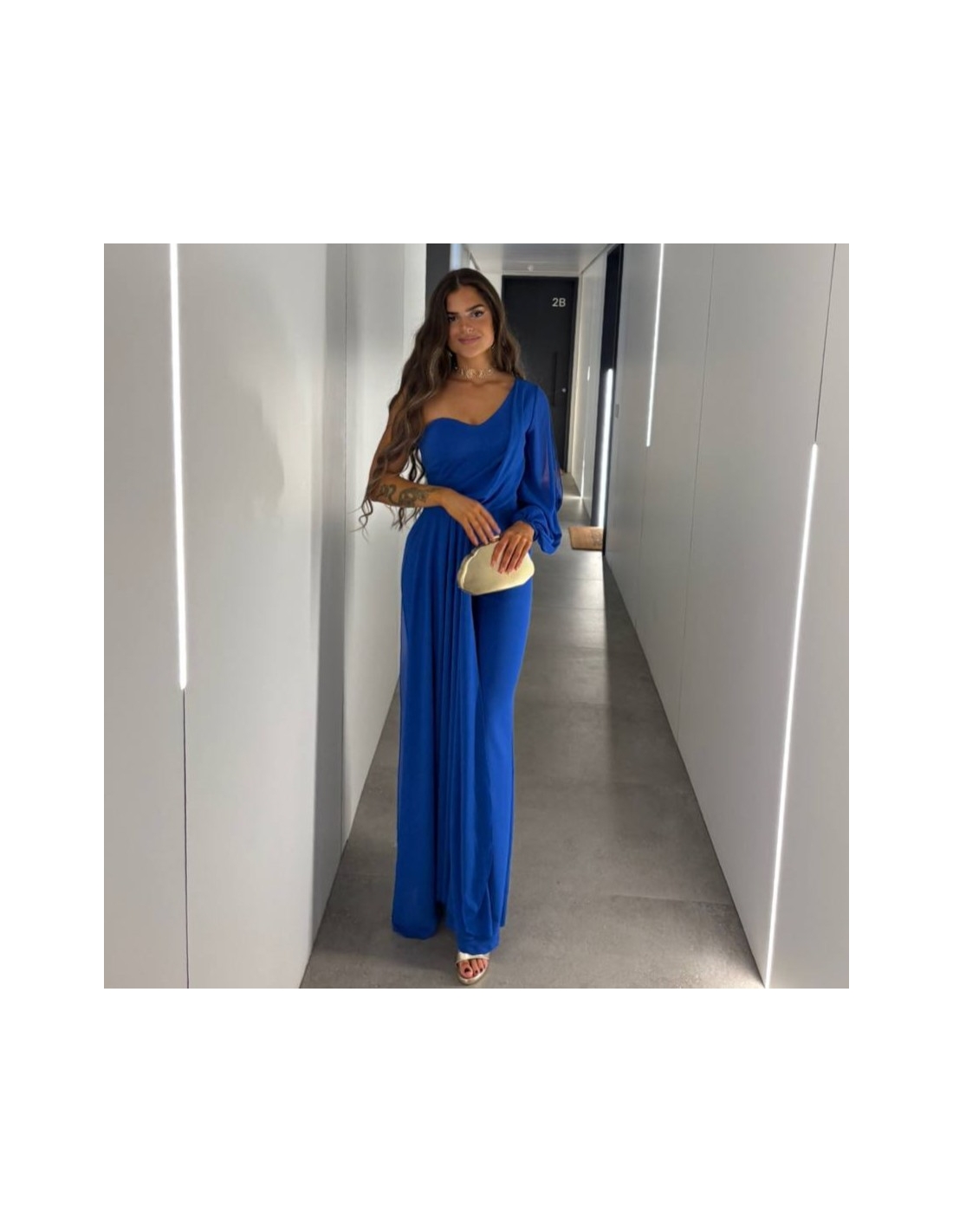 Mono gasa asimétrico en tono. Nudo en parte delantera. Casco incorporado en el pecho. Cierre trasero con cremallera oculta. Talla única