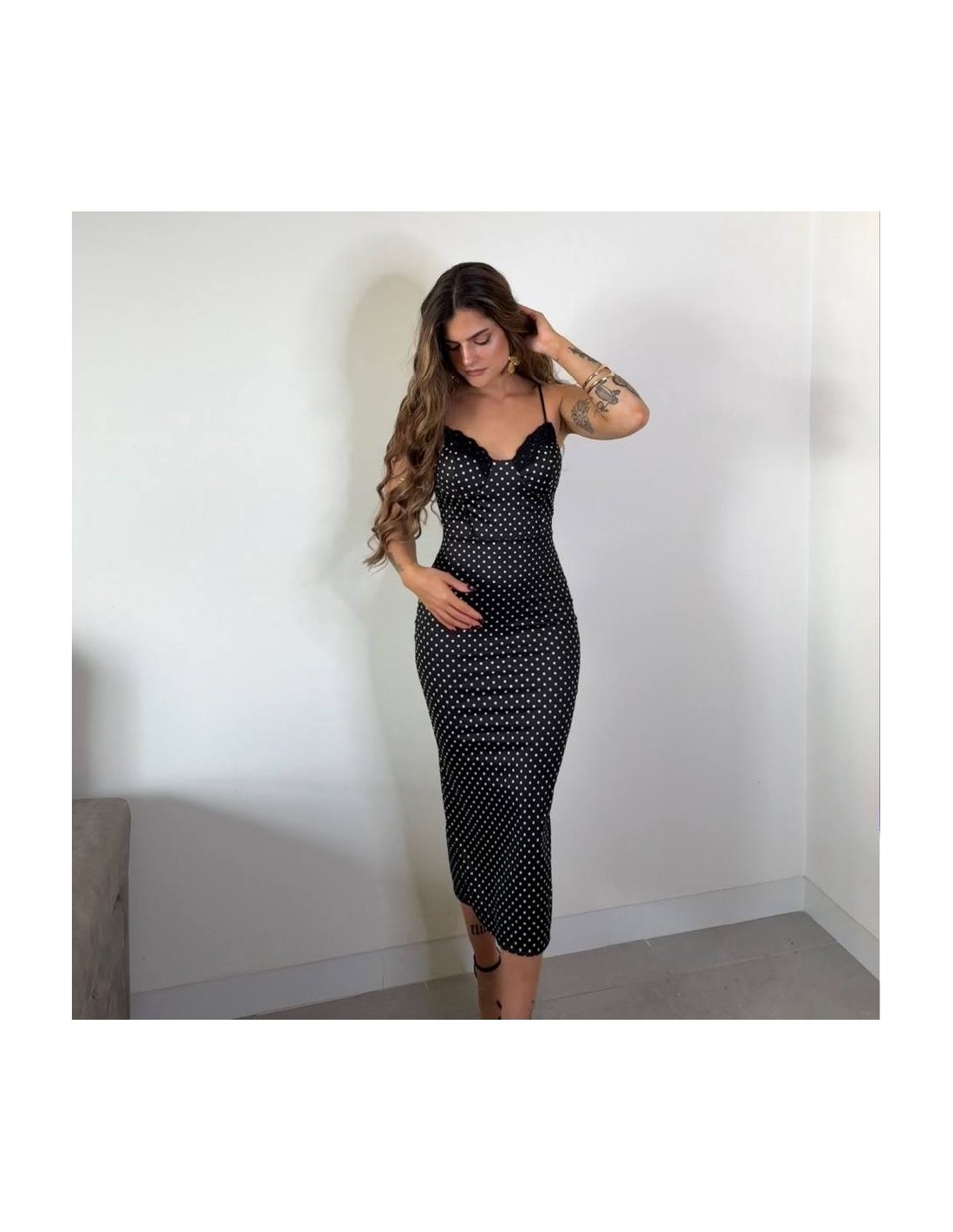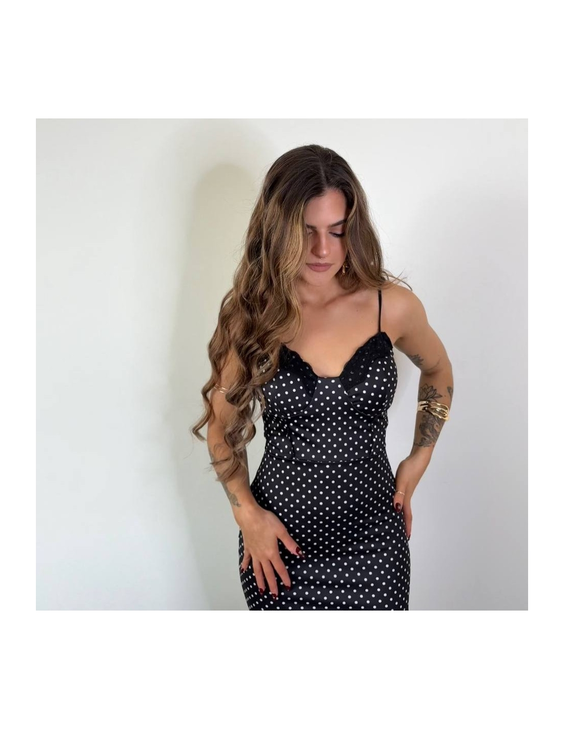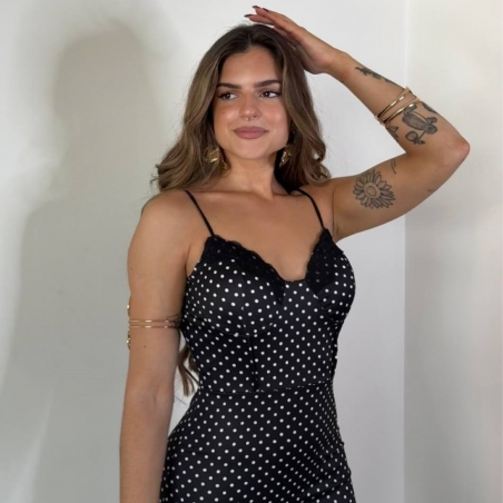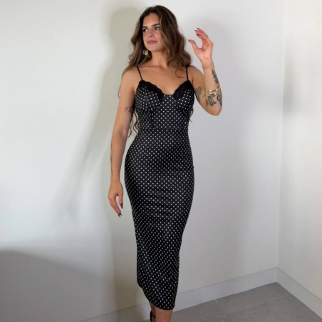 Vestido ajustado de escote corazón y encaje con estampado de lunares. Tiranta fina regulable. Talla única.