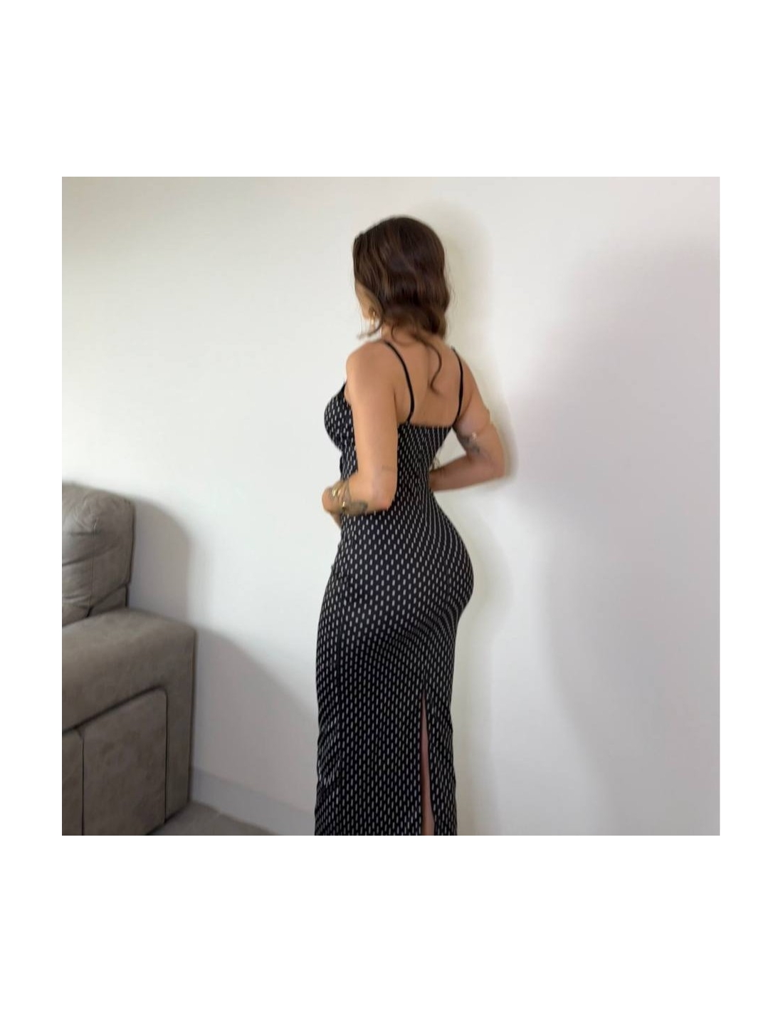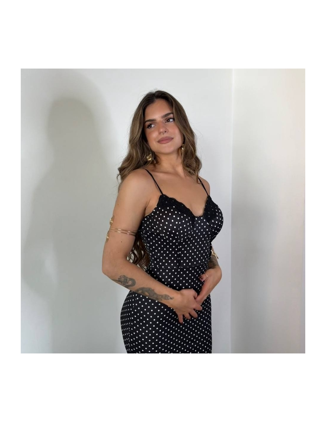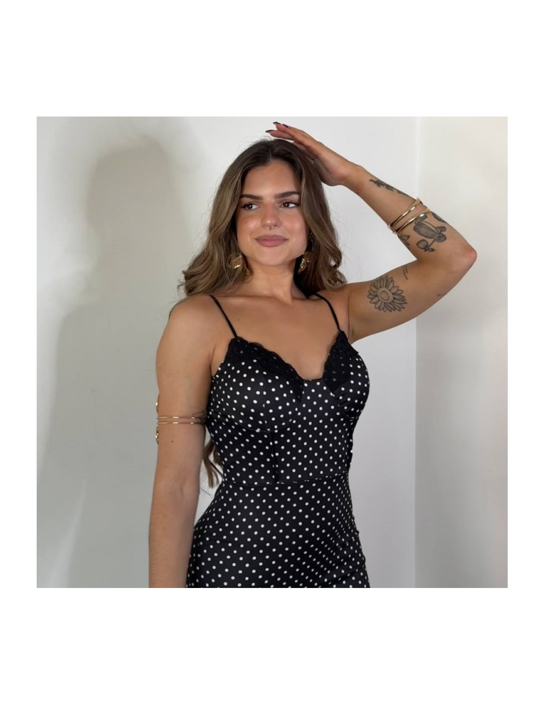 Vestido ajustado de escote corazón y encaje con estampado de lunares. Tiranta fina regulable. Talla única.