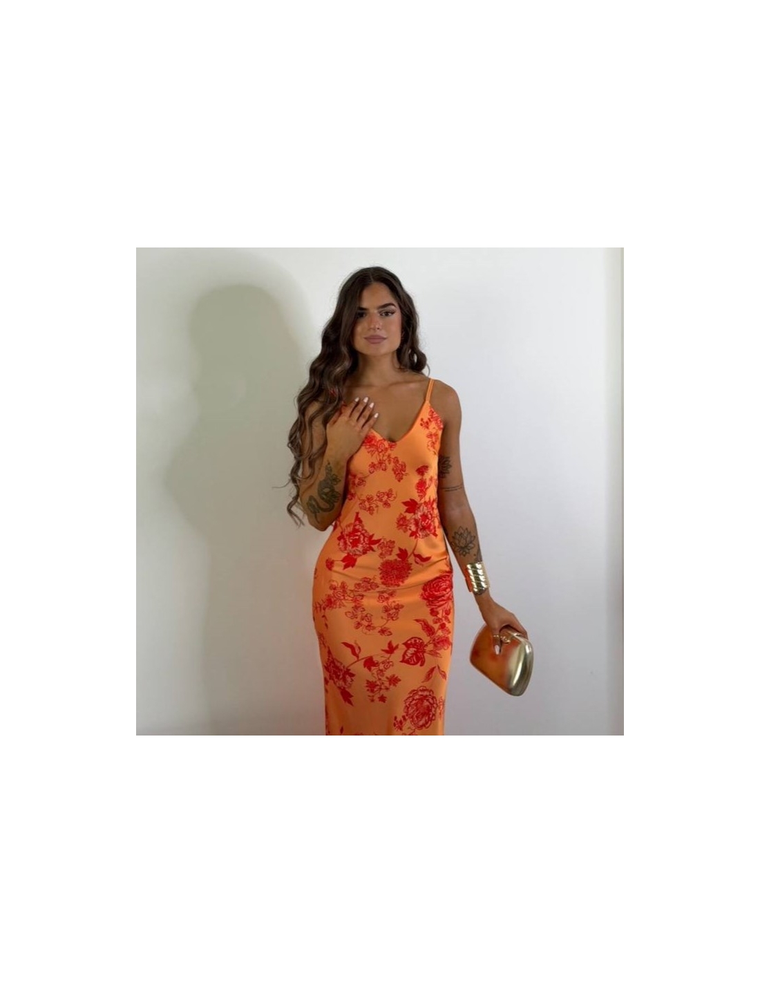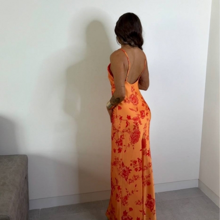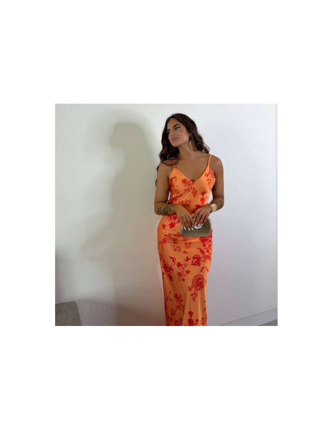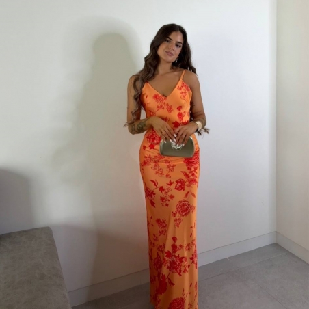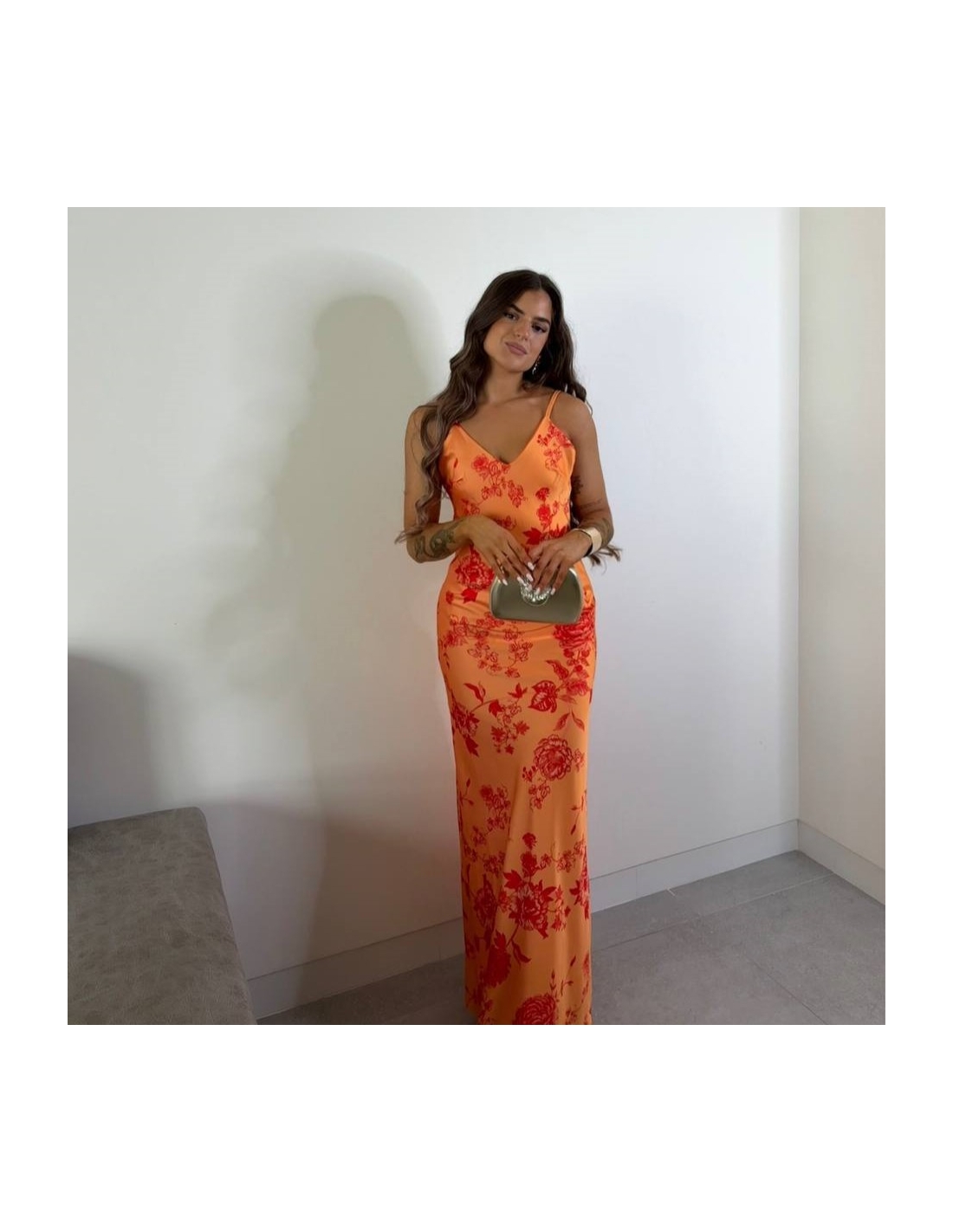 Vestido evento satén estampado en tono naranja y rojo. Con tirantas finas regulables a tono. Talla única
