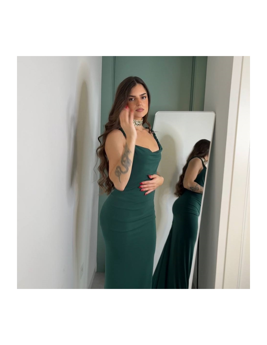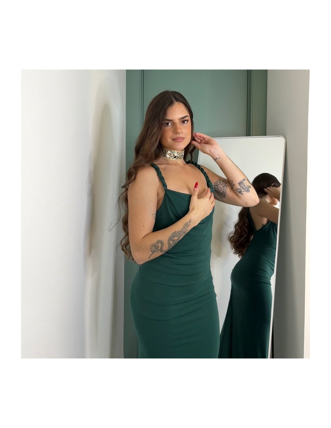 Vestido evento largo en tono verde botella. Tirantas trenzadas a tono. Fruncido en parte trasera. Escote fluido. Elástico. Doble tejido. Talla única