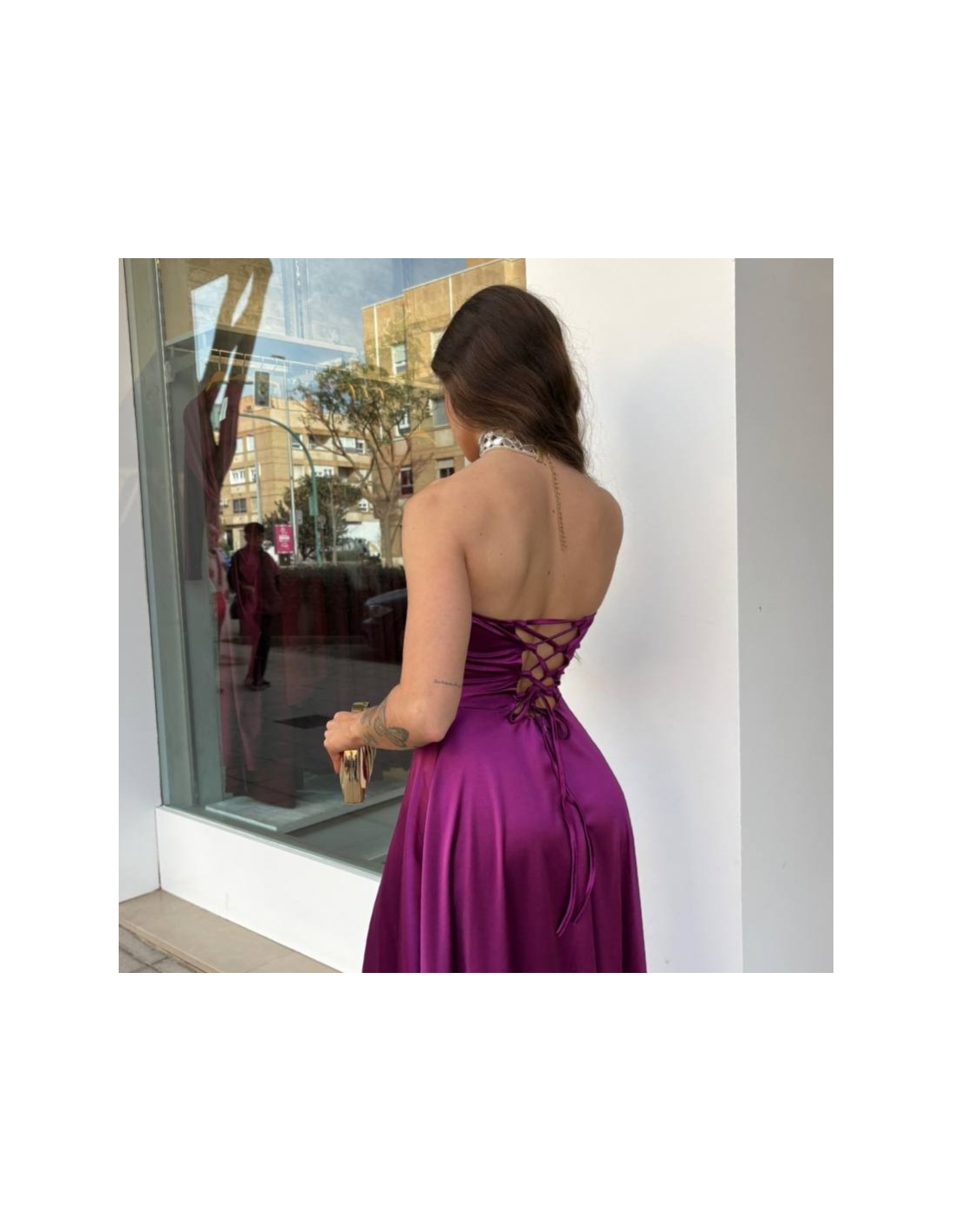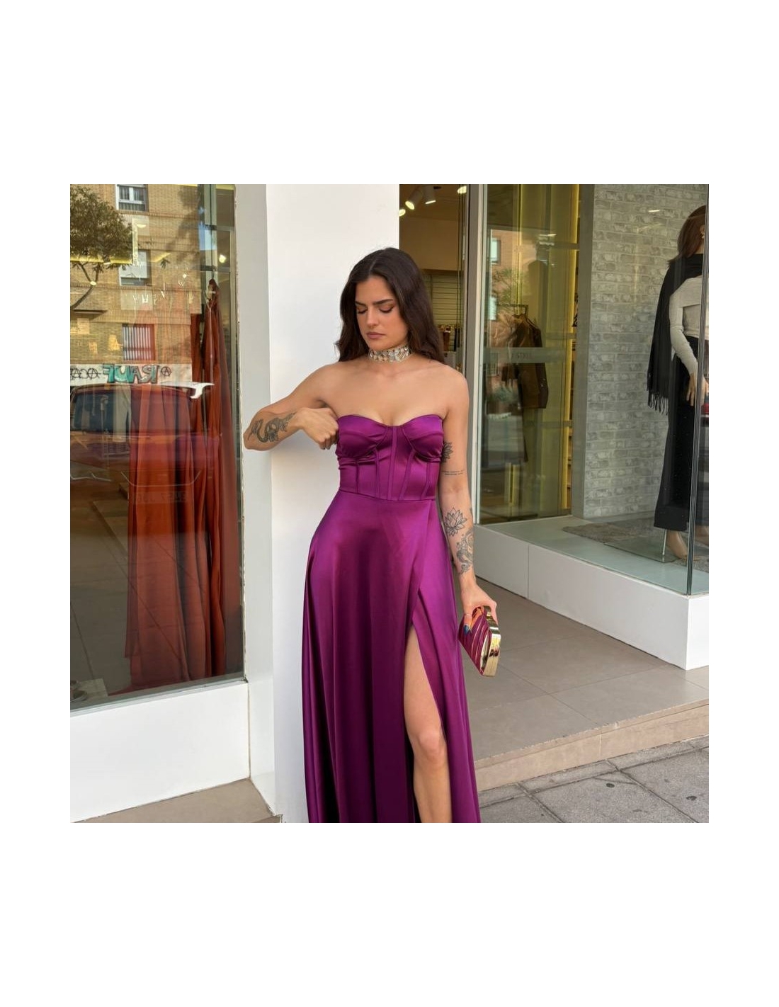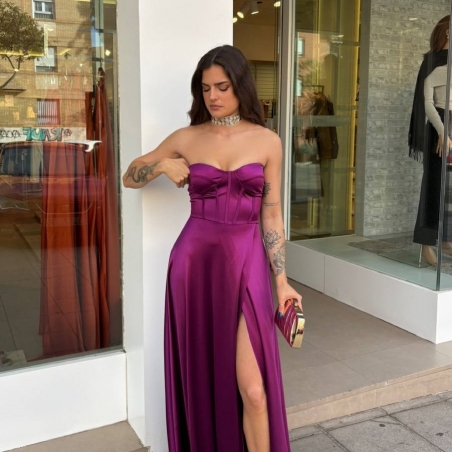 Vestido corset satén. Casco incorporado. Fluido con abertura delantera. Talla única