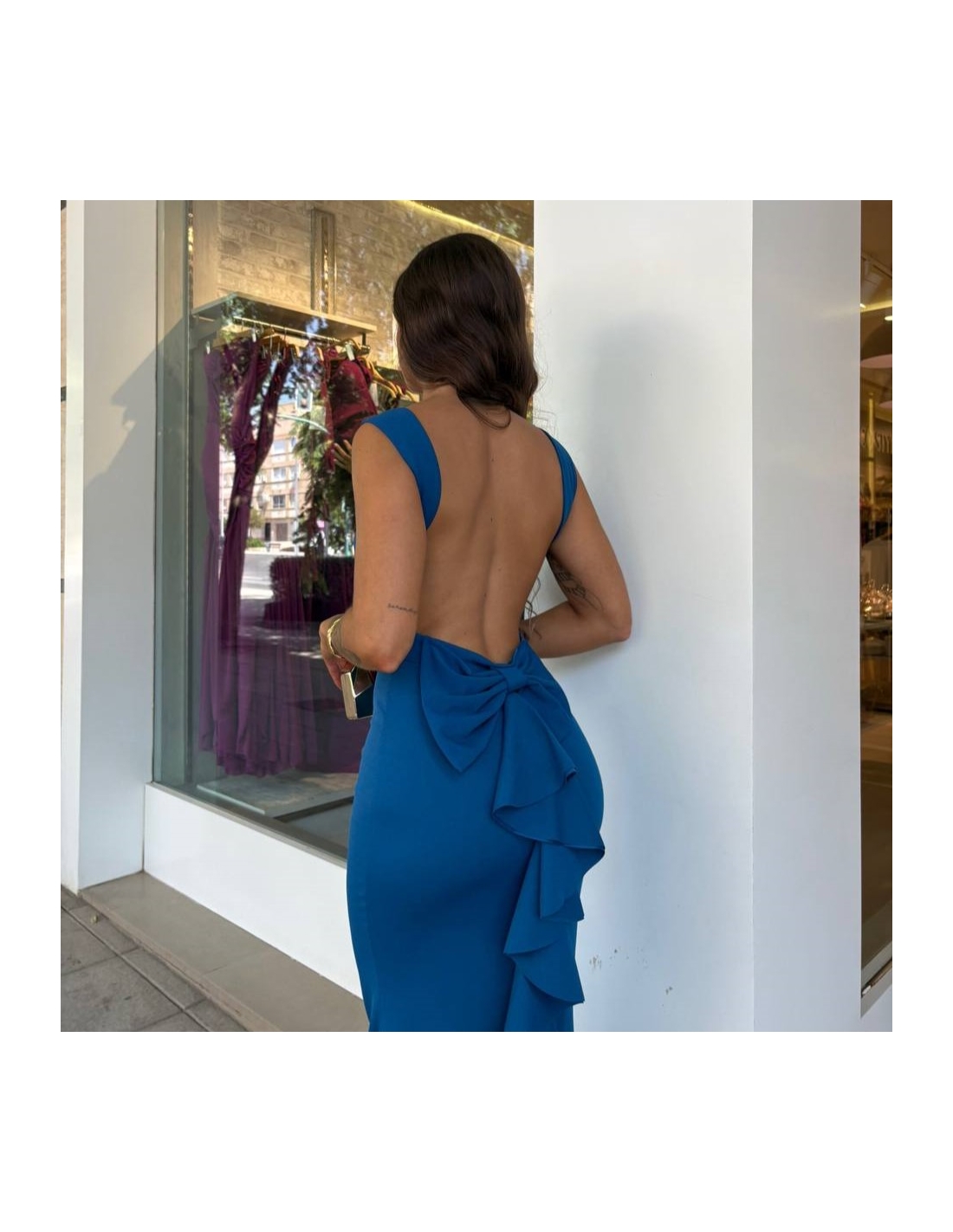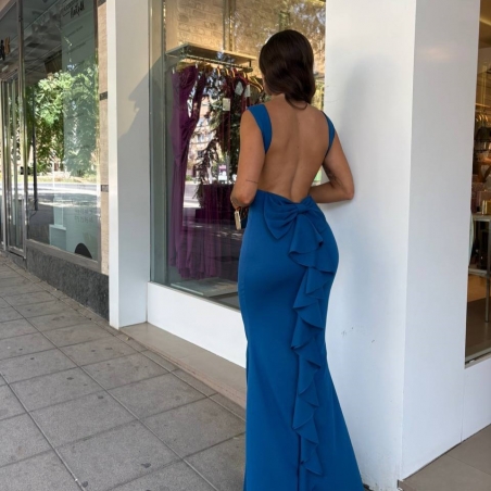 Vestido sirena largo con lazo en parte trasera y volantito. Casco incorporado en el pecho. Escote en espalda. Talla única