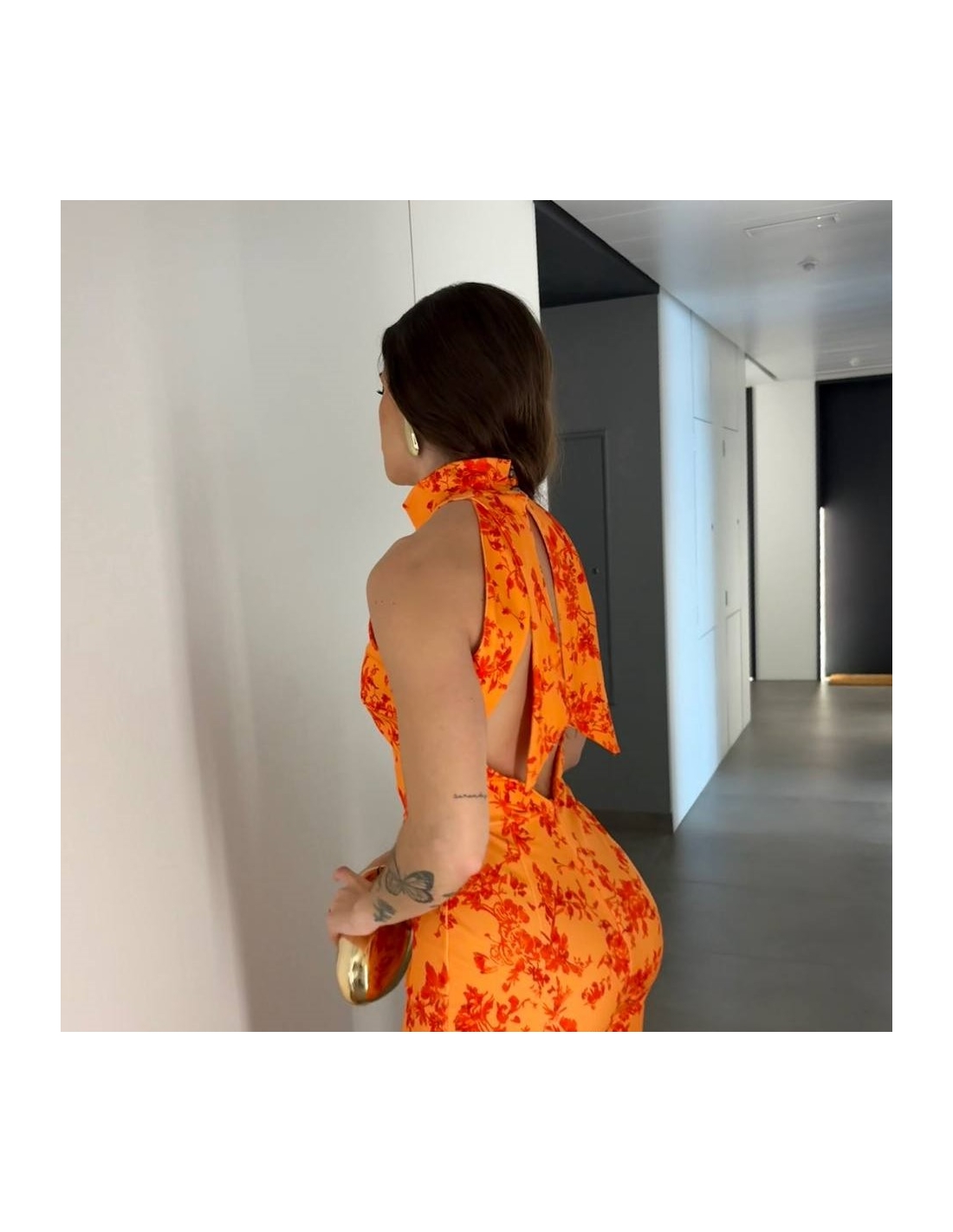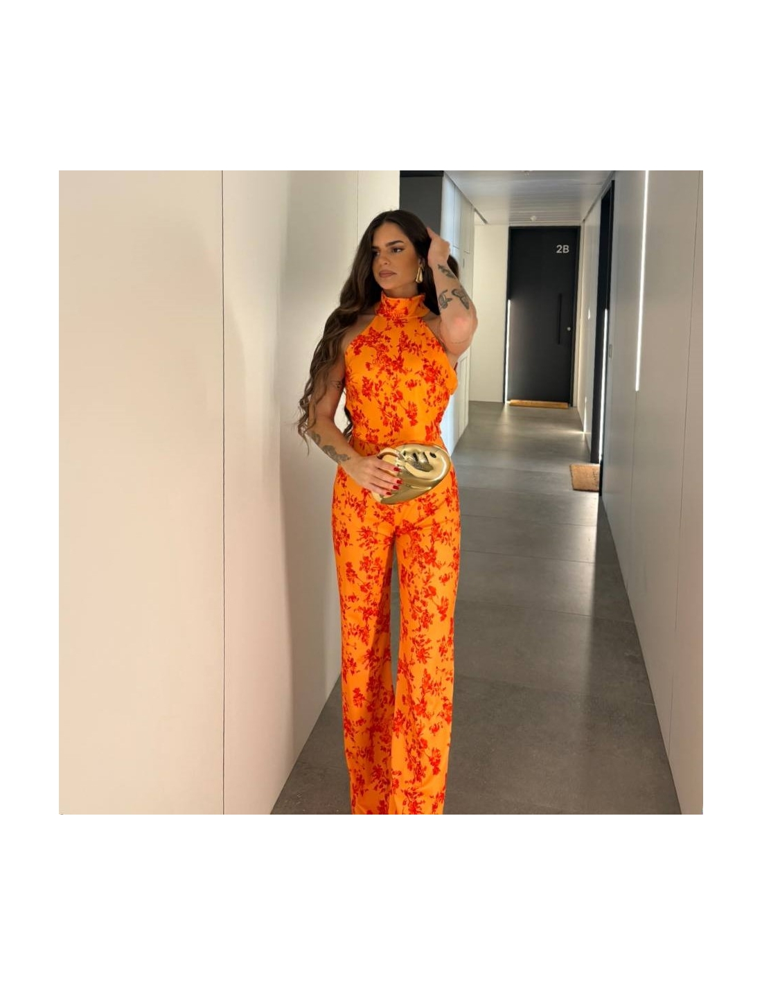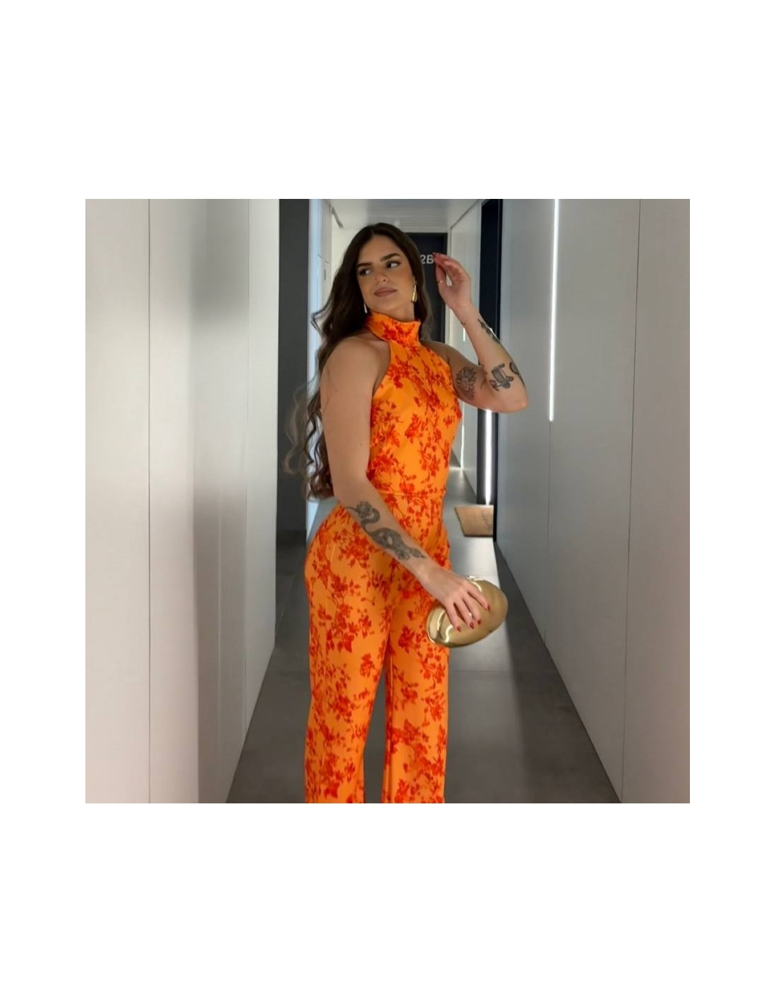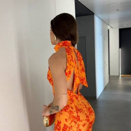 Mono largo campana con escote en espalda. Cuello halter. Posibilidad de lazada trasera. Talla única.