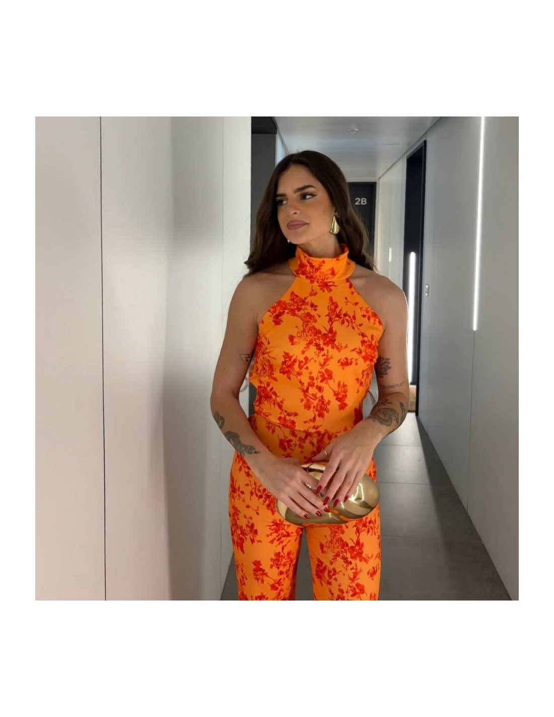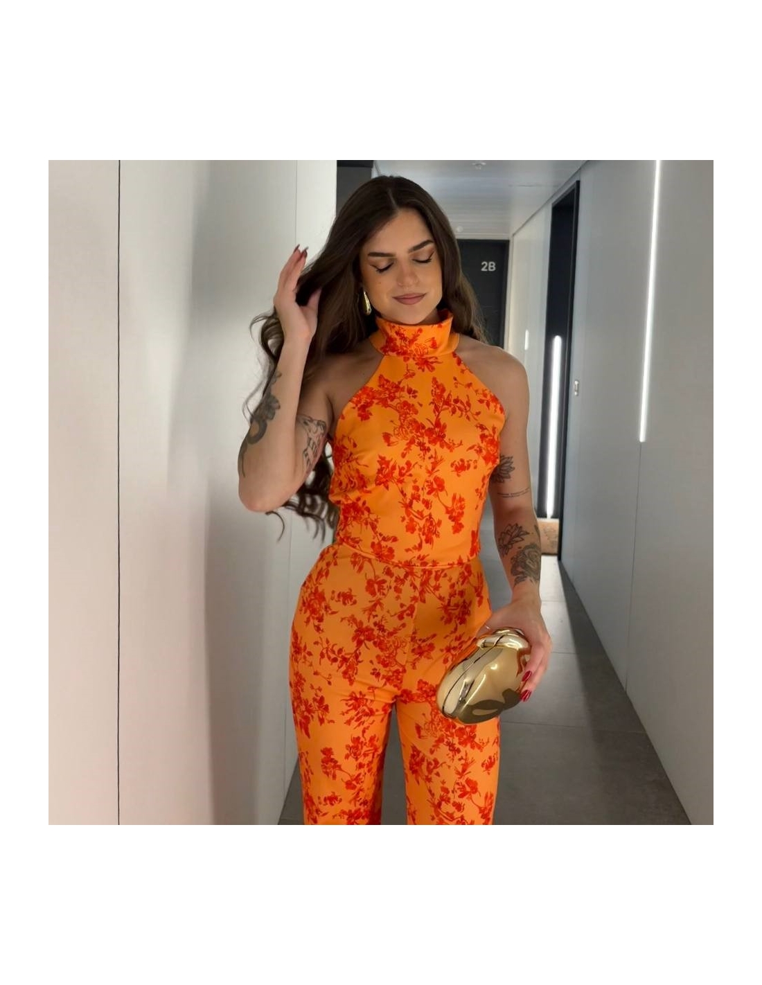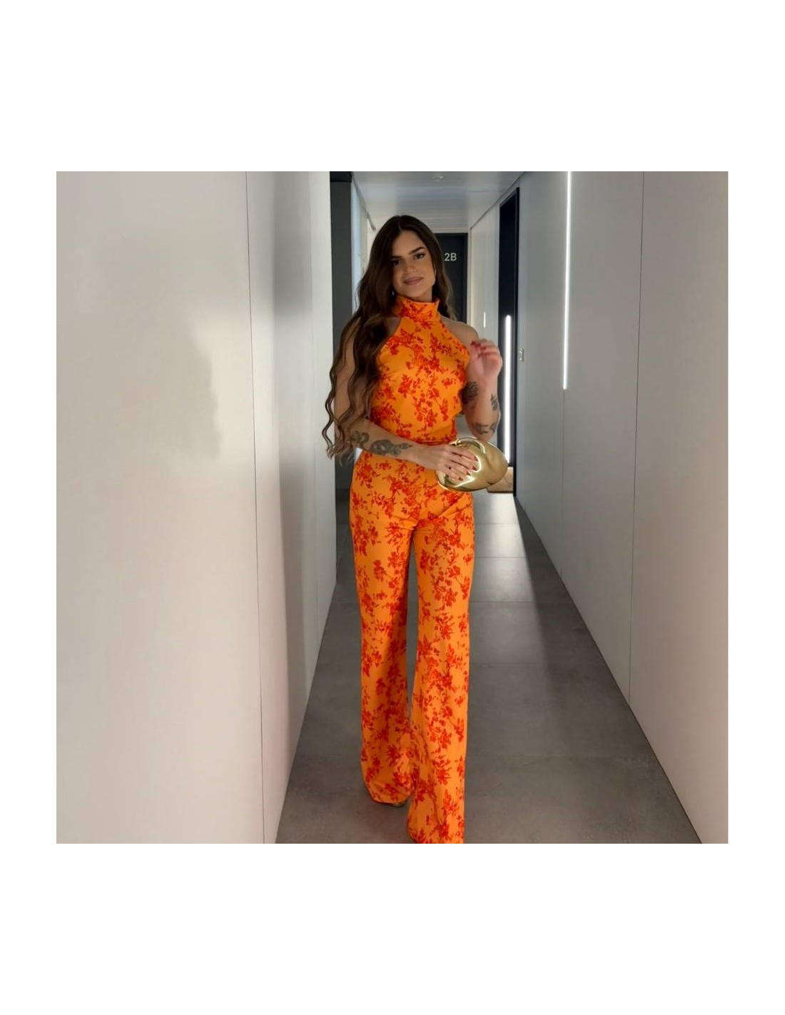 Mono largo campana con escote en espalda. Cuello halter. Posibilidad de lazada trasera. Talla única.
