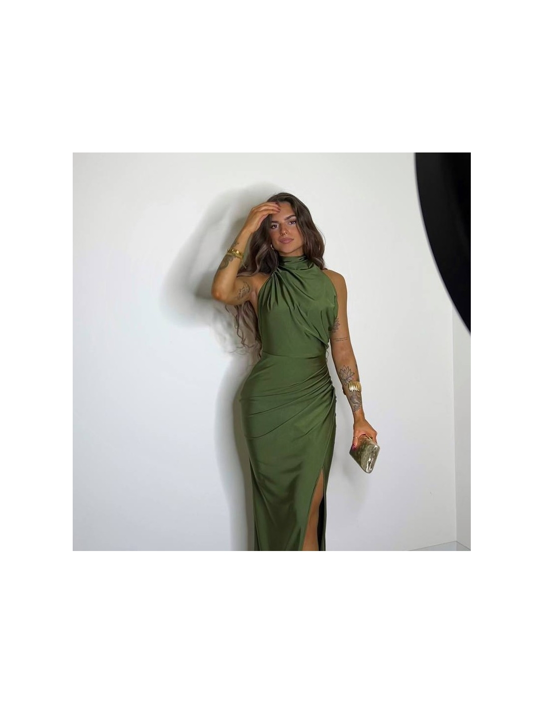 Vestido halter largo. Fruncido en parte delantera. Cierre trasero con cremallera oculta. Talla única
