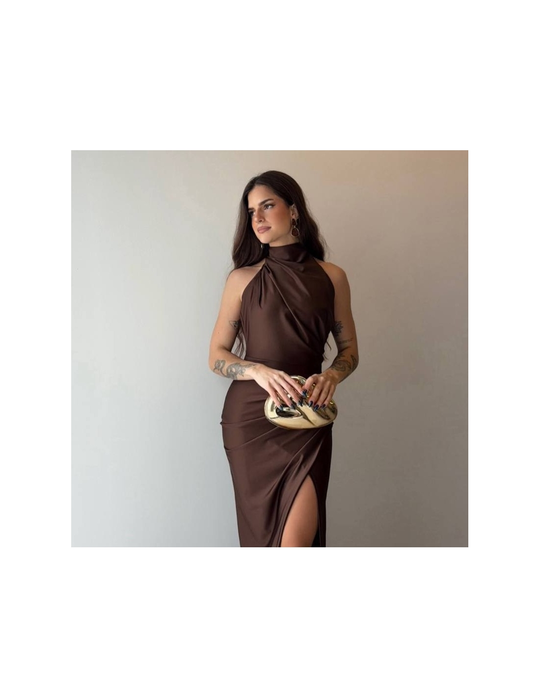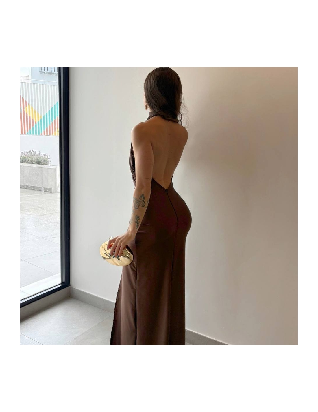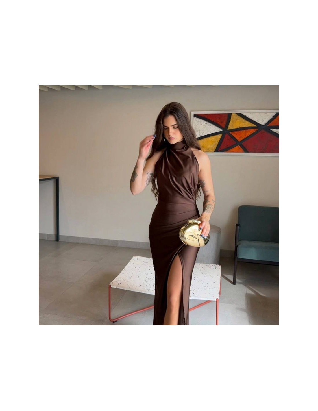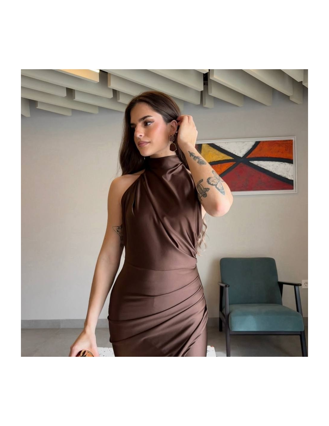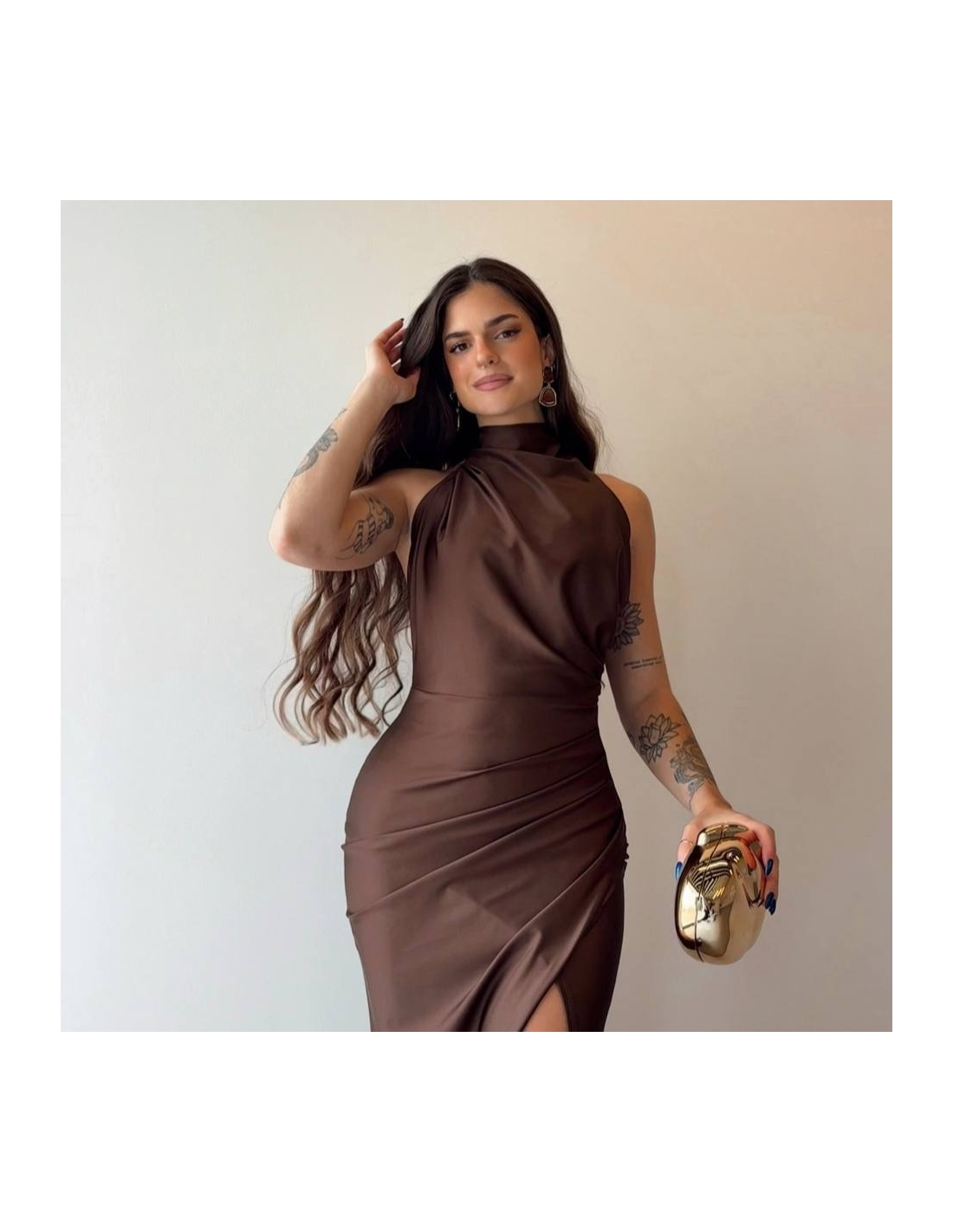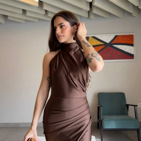 Vestido halter largo. Fruncido en parte delantera. Cierre trasero con cremallera oculta. Talla única