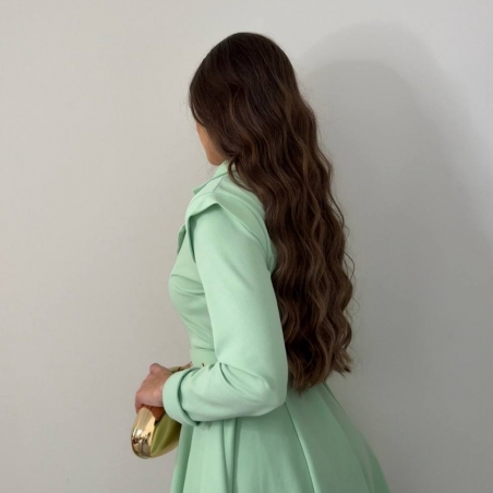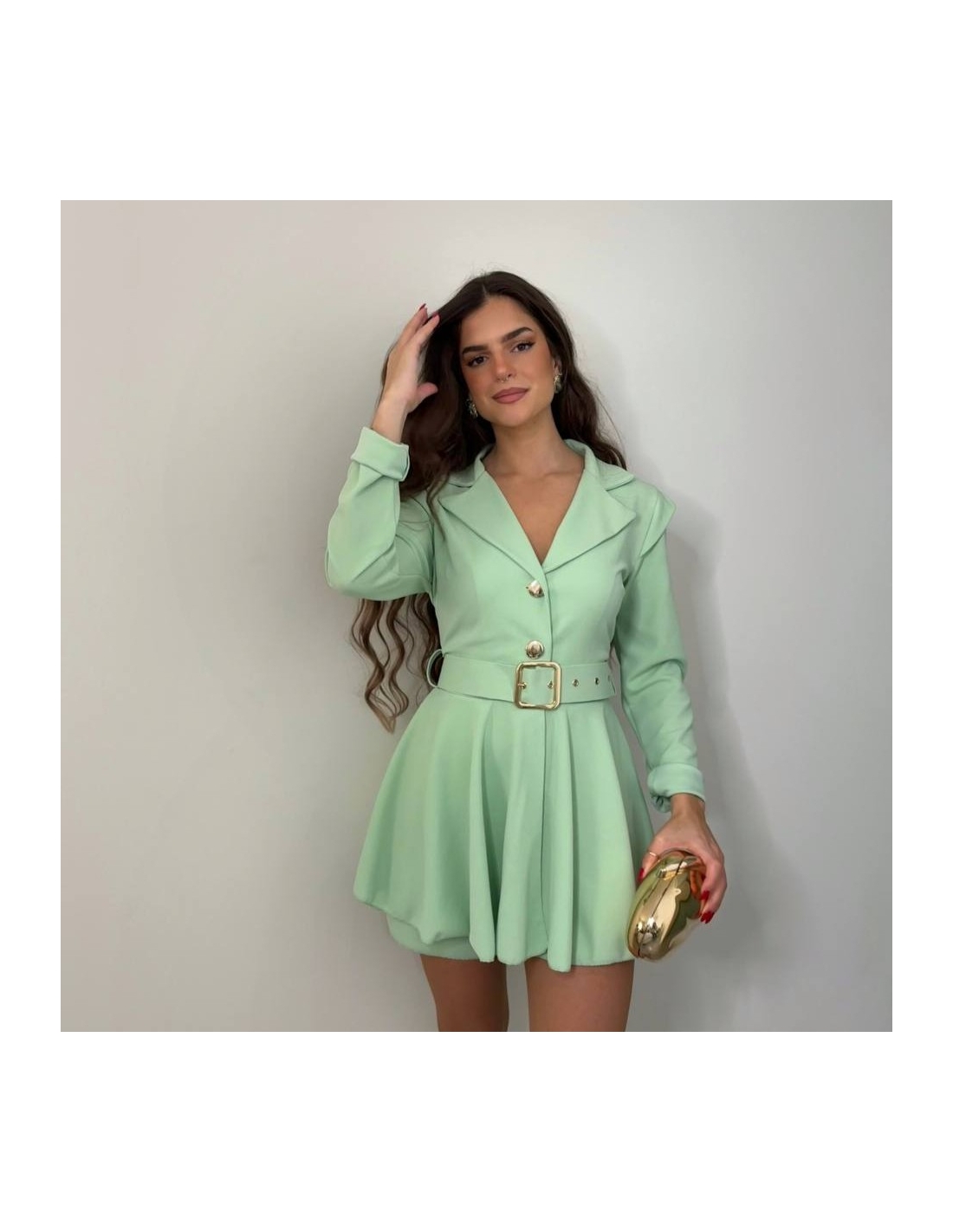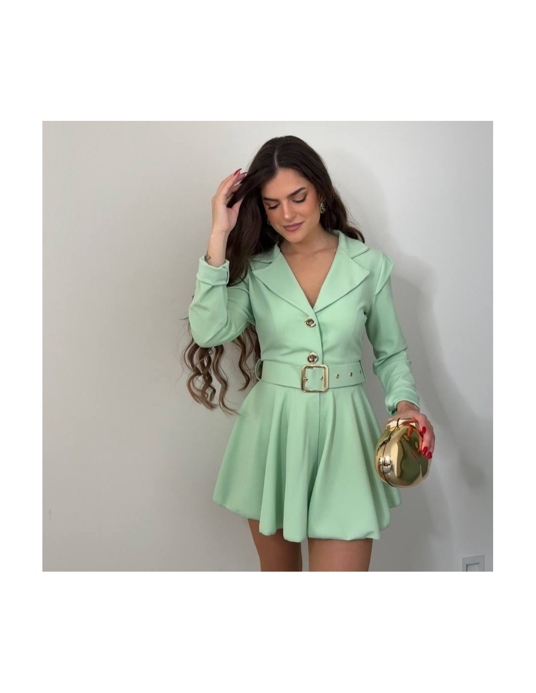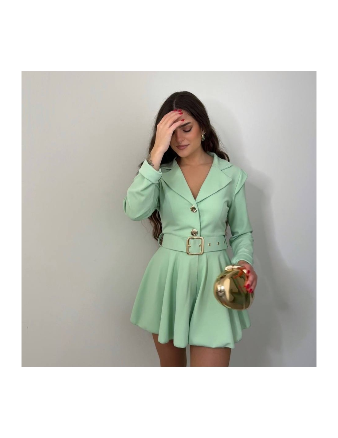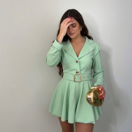 Mono cuelo corto de manga larga. Con cinturón a tono. Escote V y cuello de solapa. con cierre delantero abotonado. Talla única