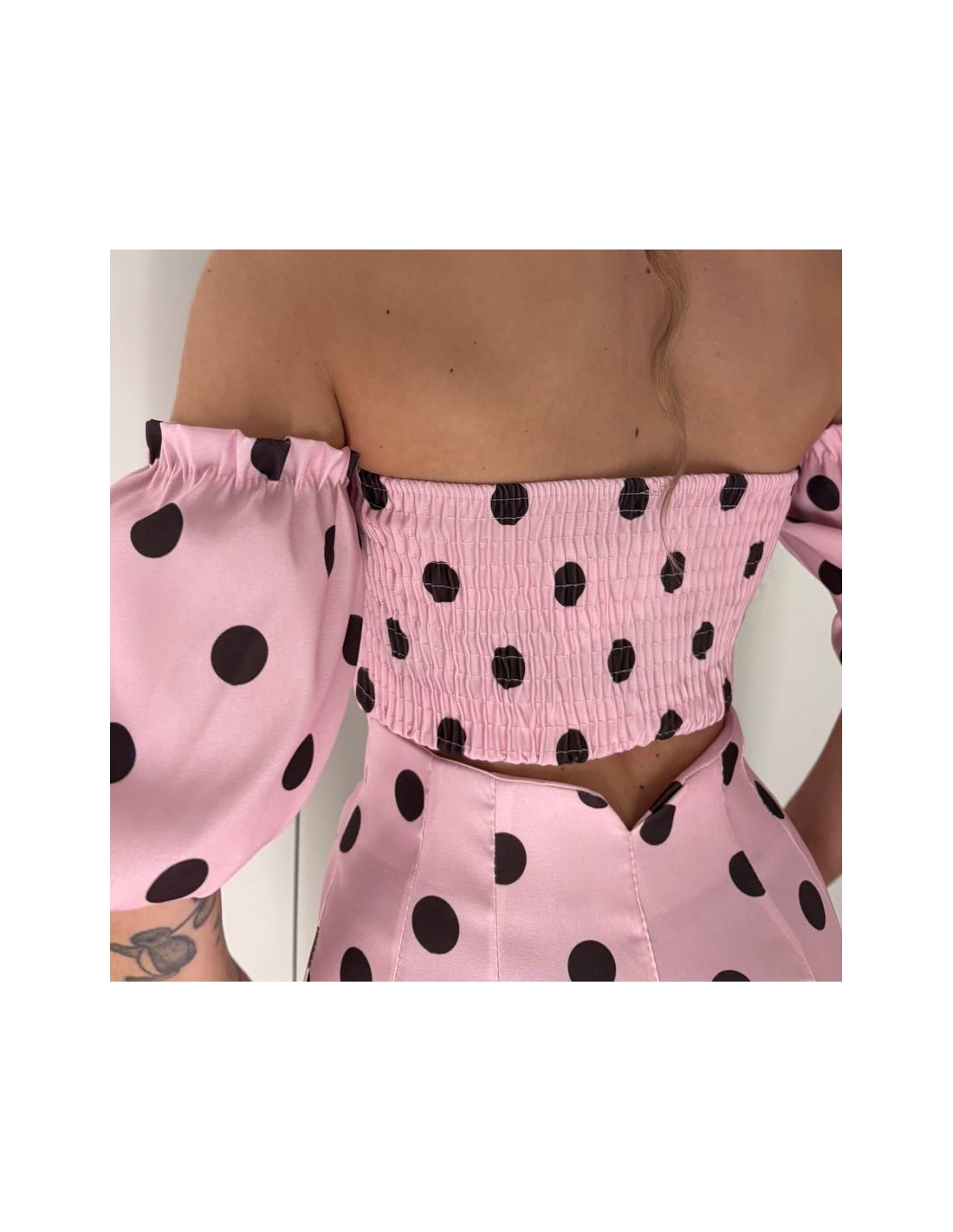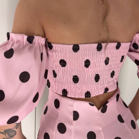 Conjunto de top más pantalón estampado. Top escote barco con panel de abeja en parte trasera y manga corta abullonada. Pantalón de tiro alto elástico.