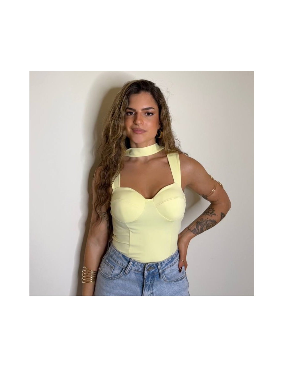 Top escote corazón de tejido doble licra gruesa. Cascos incorporados. Lazada opcional incluída. Talla única.