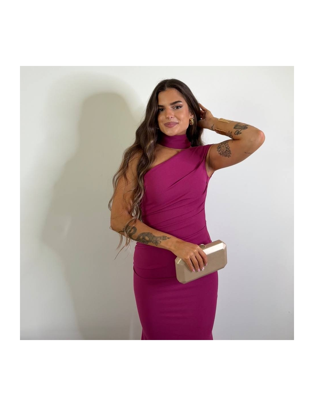 Vestido evento largo ajustado en tono magenta. Con lazada a tono. Fruncido en parte delantera. Talla única