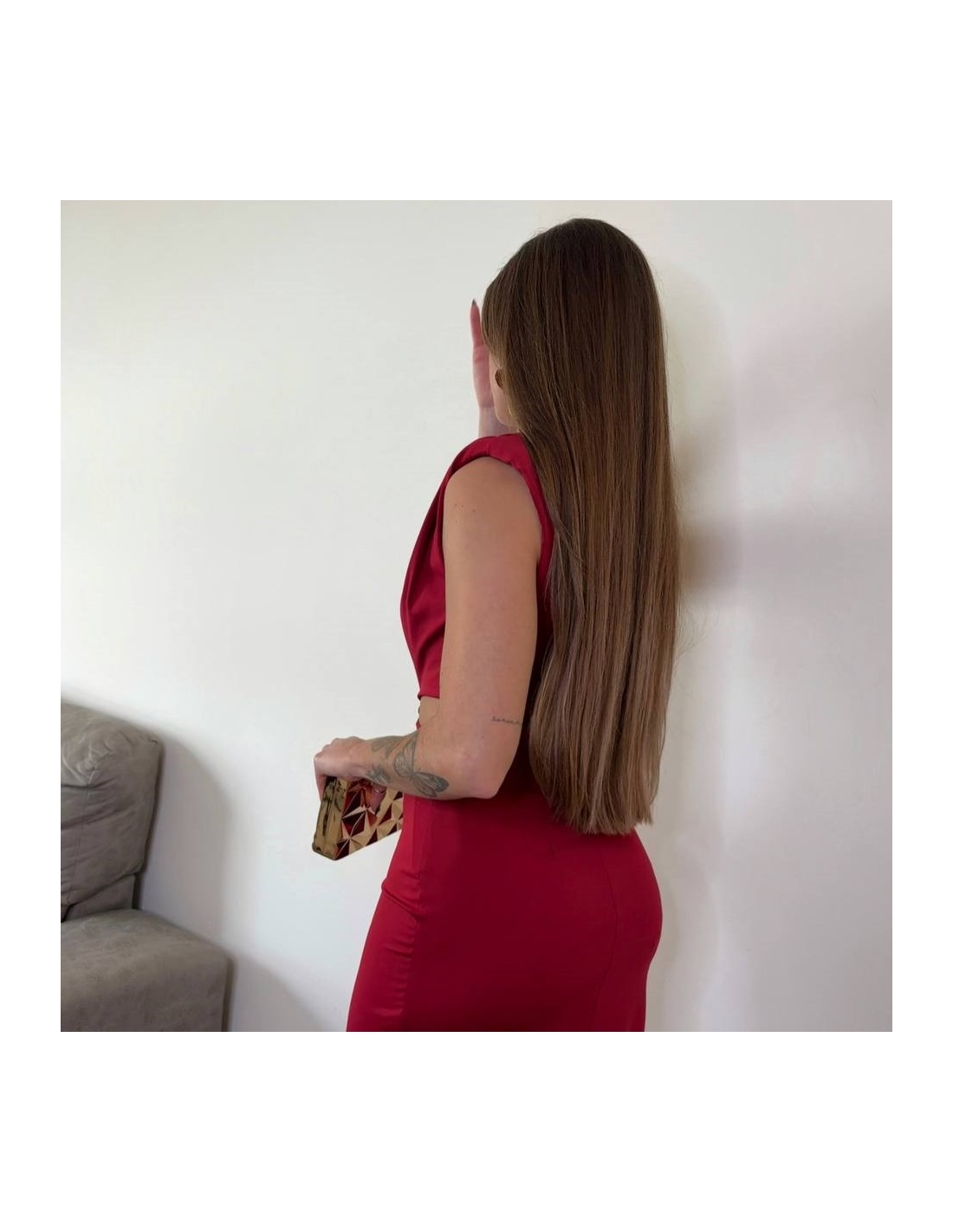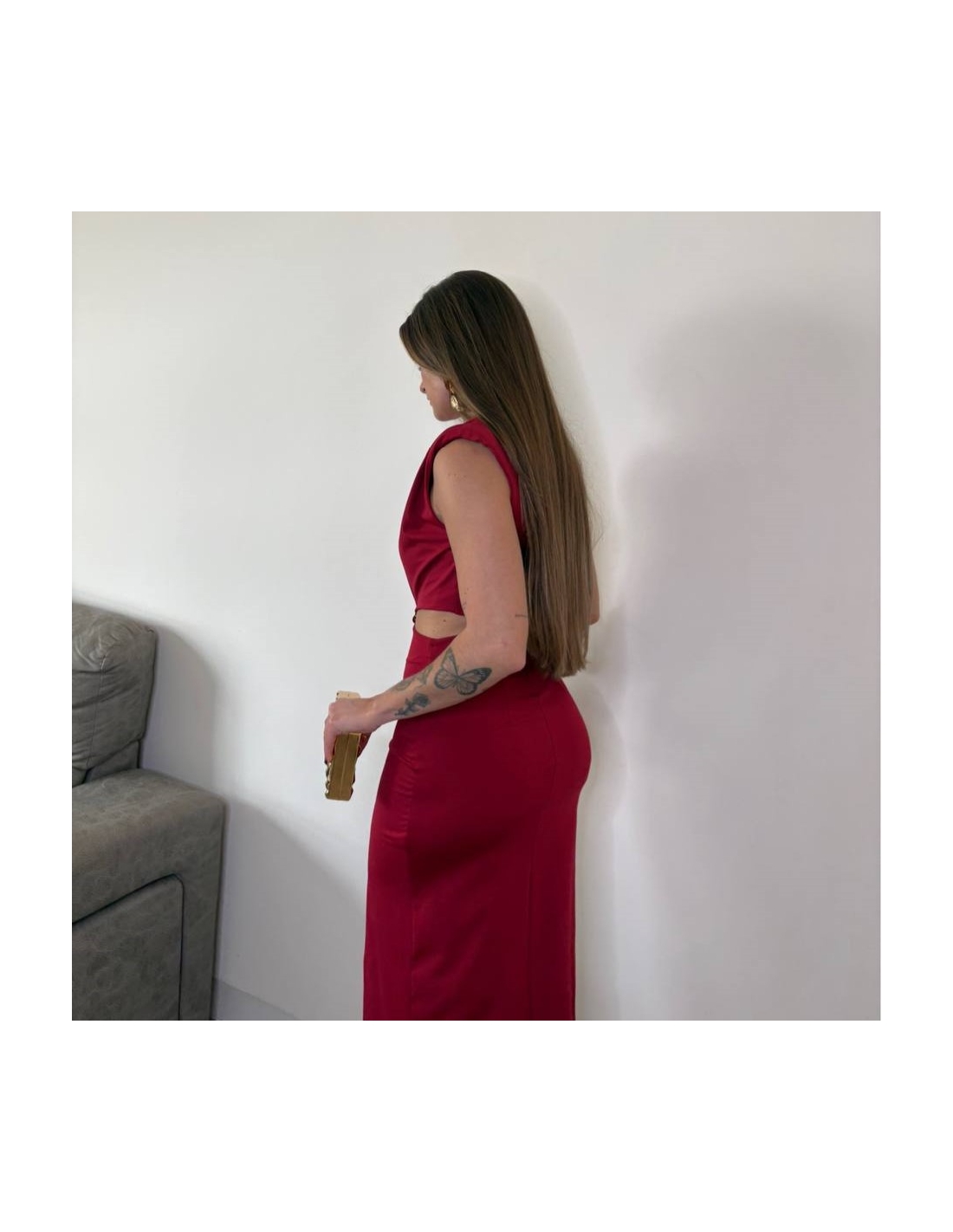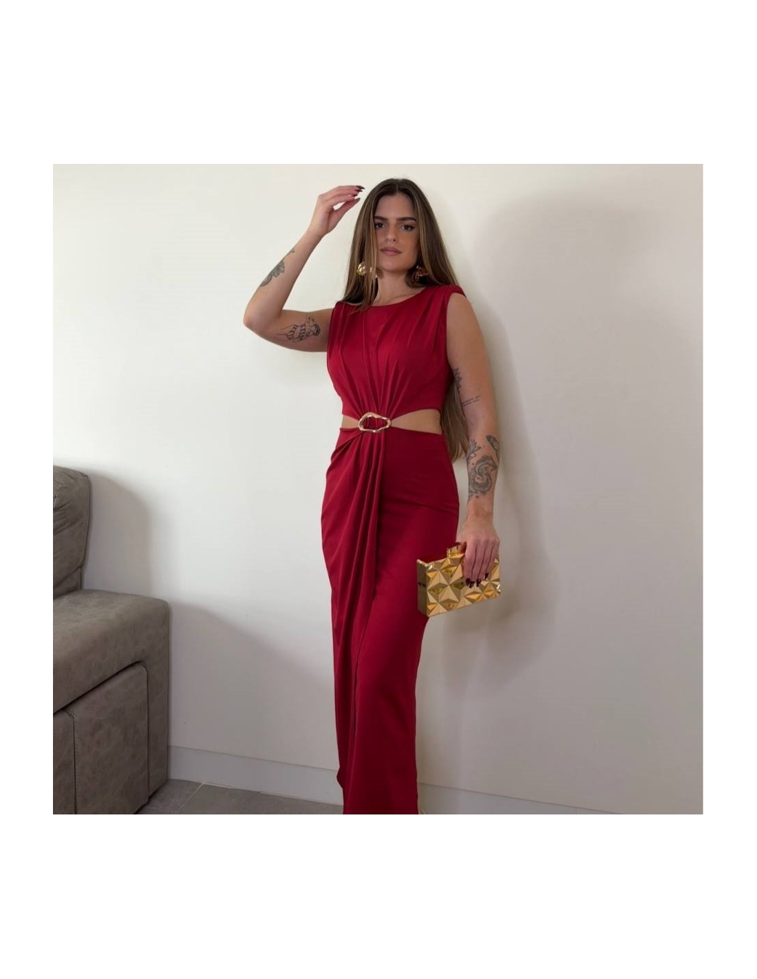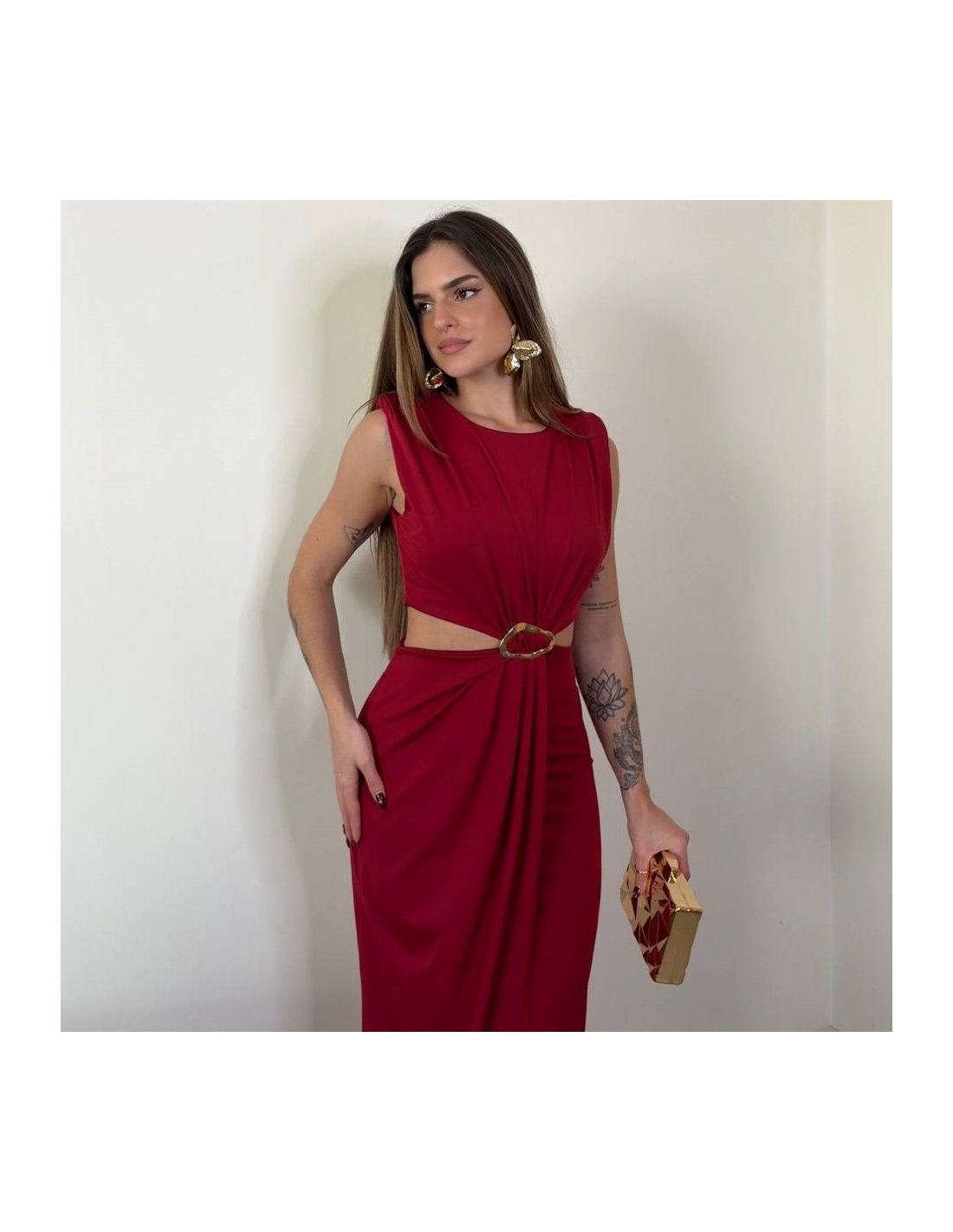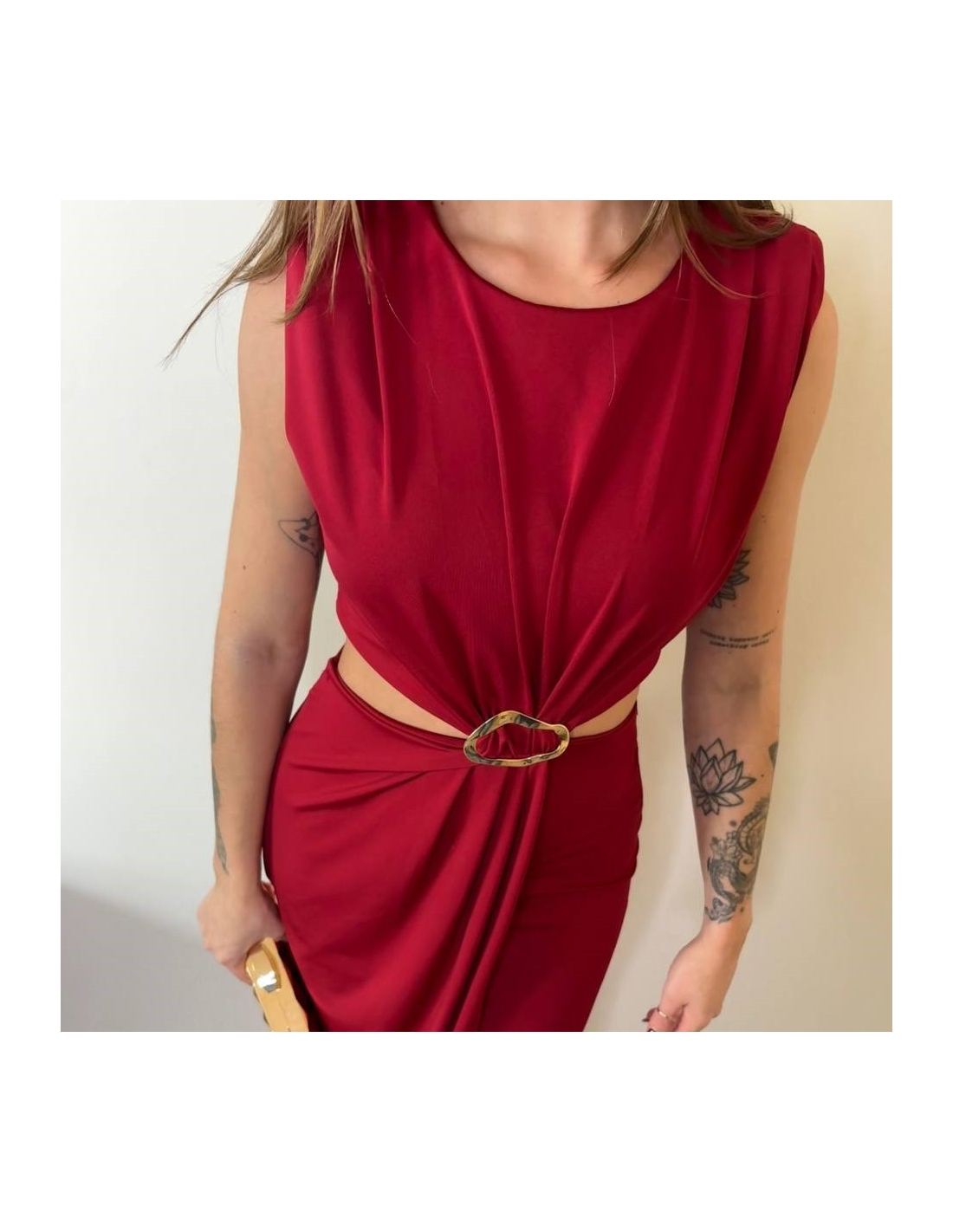 Vestido evento midi con hombreras. Fruncido en parte delantera. Joya en parte delantera central. Con aberturas. Cierre trasero con cremallera oculta. Elástico. Talla única