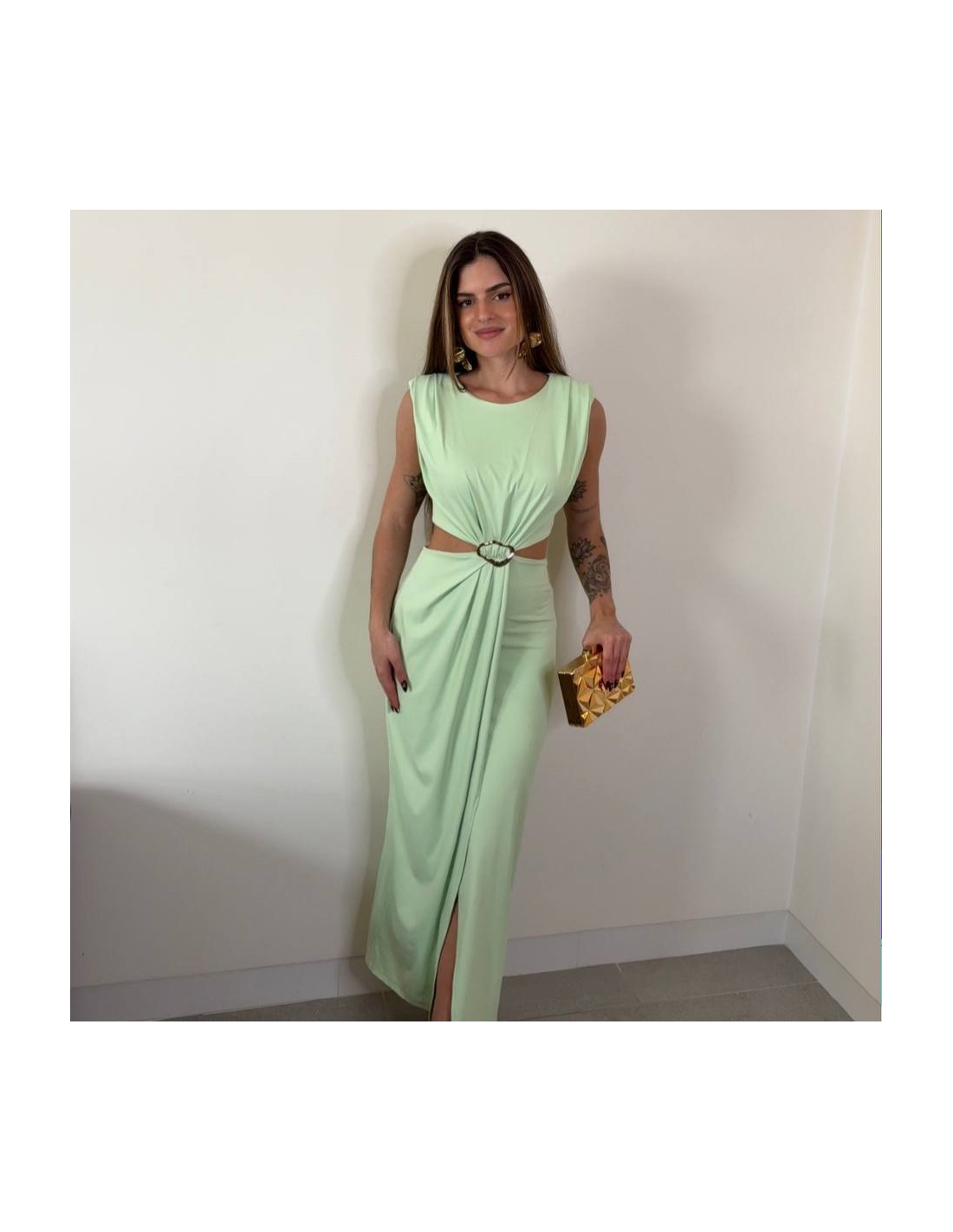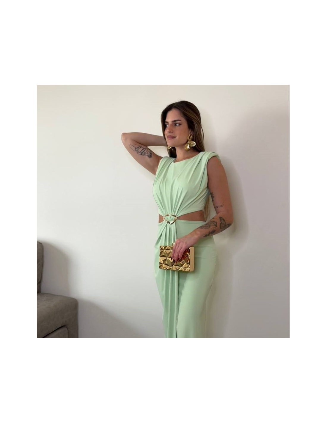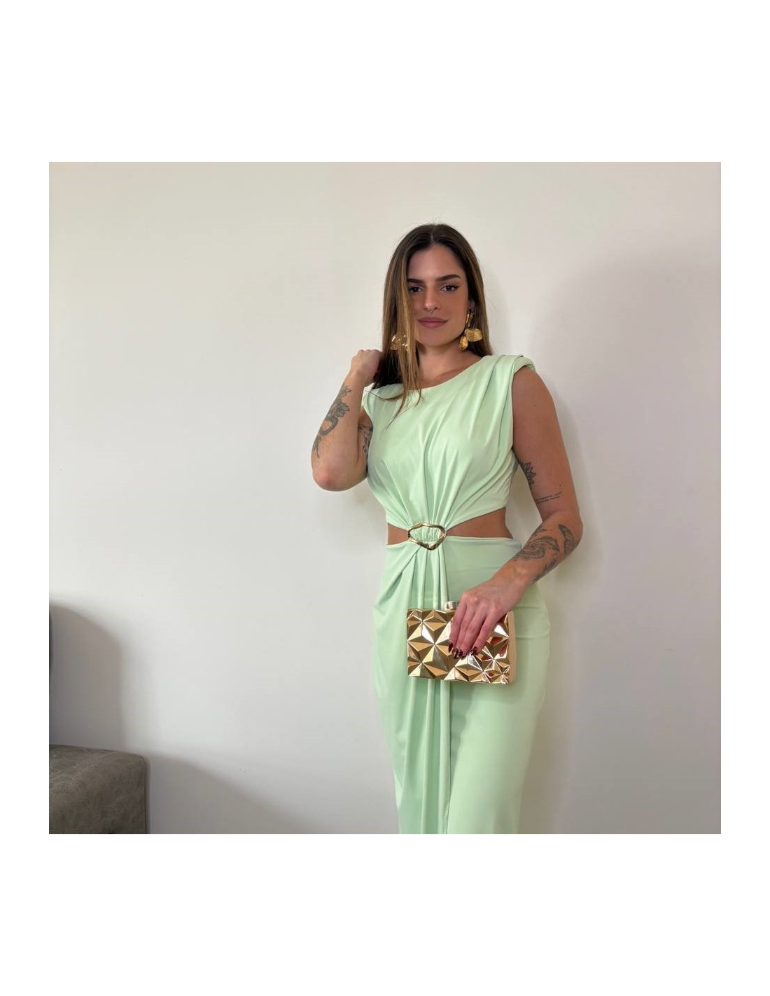Vestido evento midi con hombreras. Fruncido en parte delantera. Joya en parte delantera central. Con aberturas. Cierre trasero con cremallera oculta. Elástico. Talla única