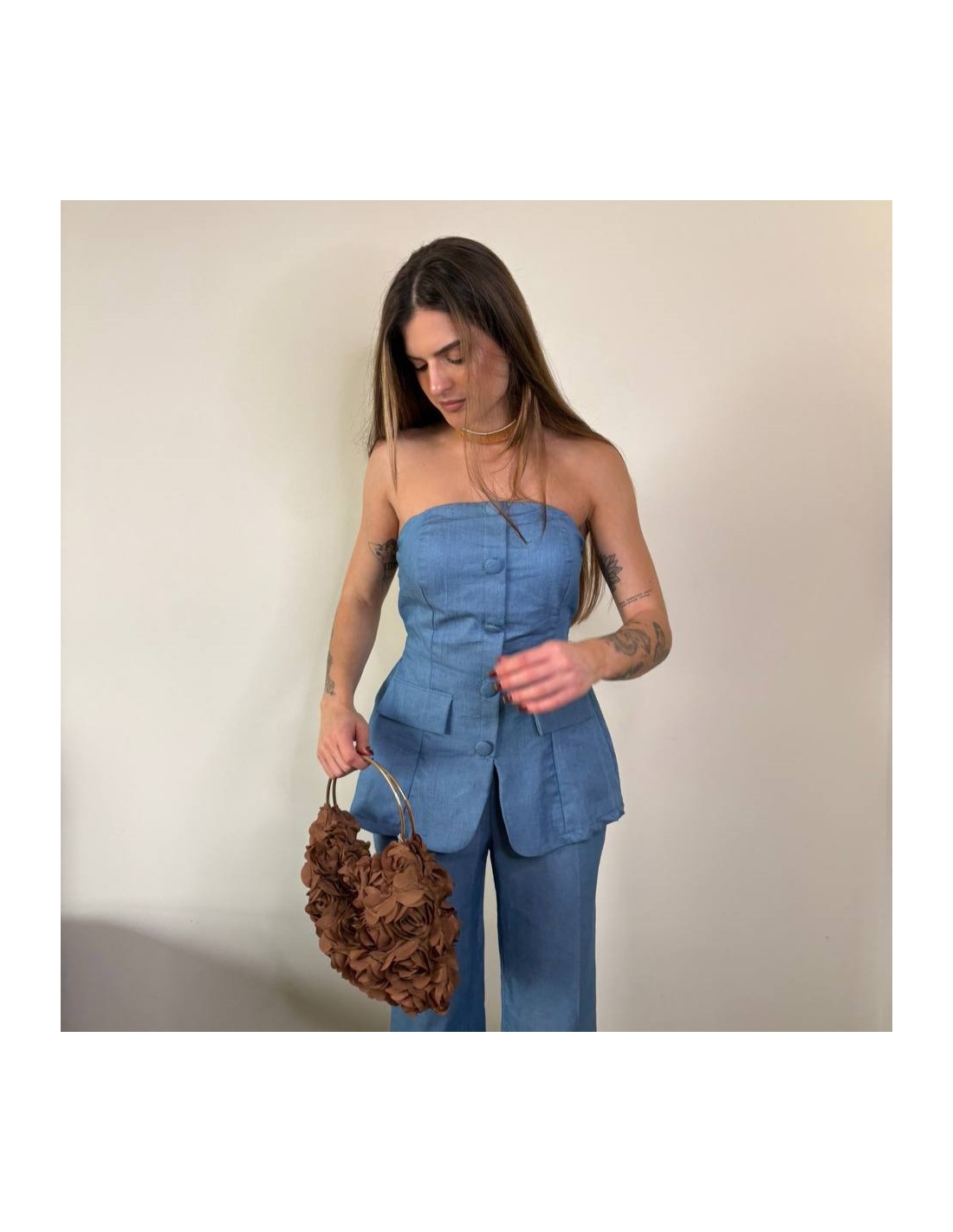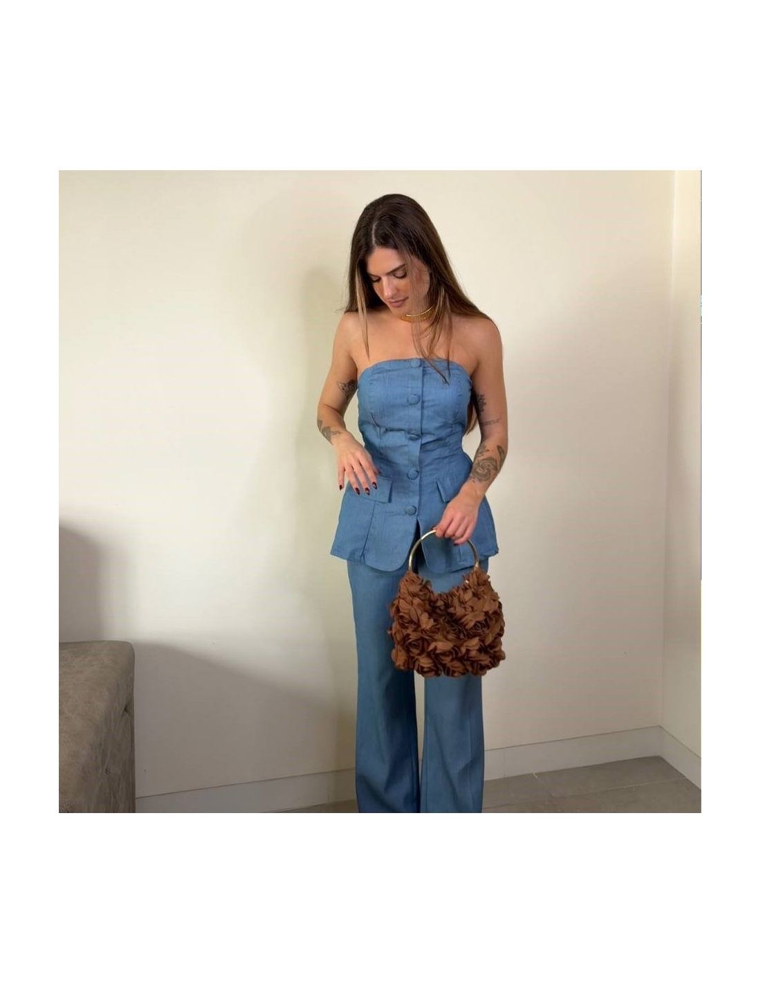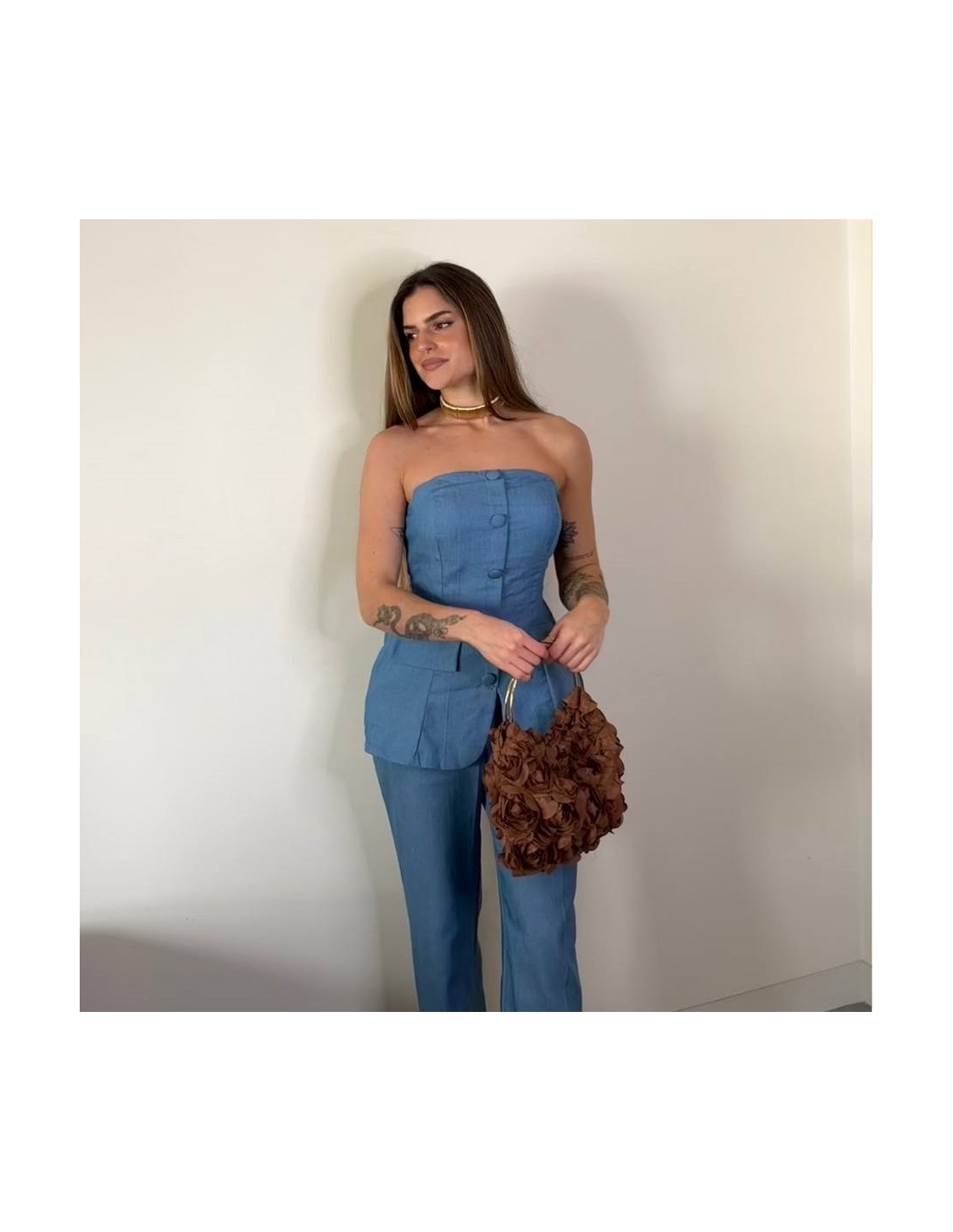 Conjunto de top más pantalón. Top de palabra de honor con falsos botones delanteros. Pantalón de tiro alto fluido. Con cintura elástica. Talla única