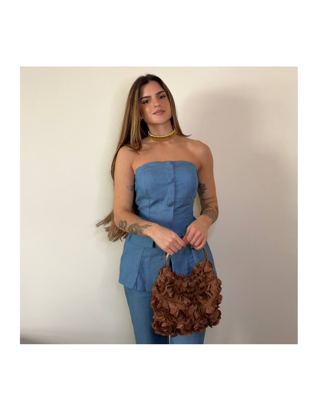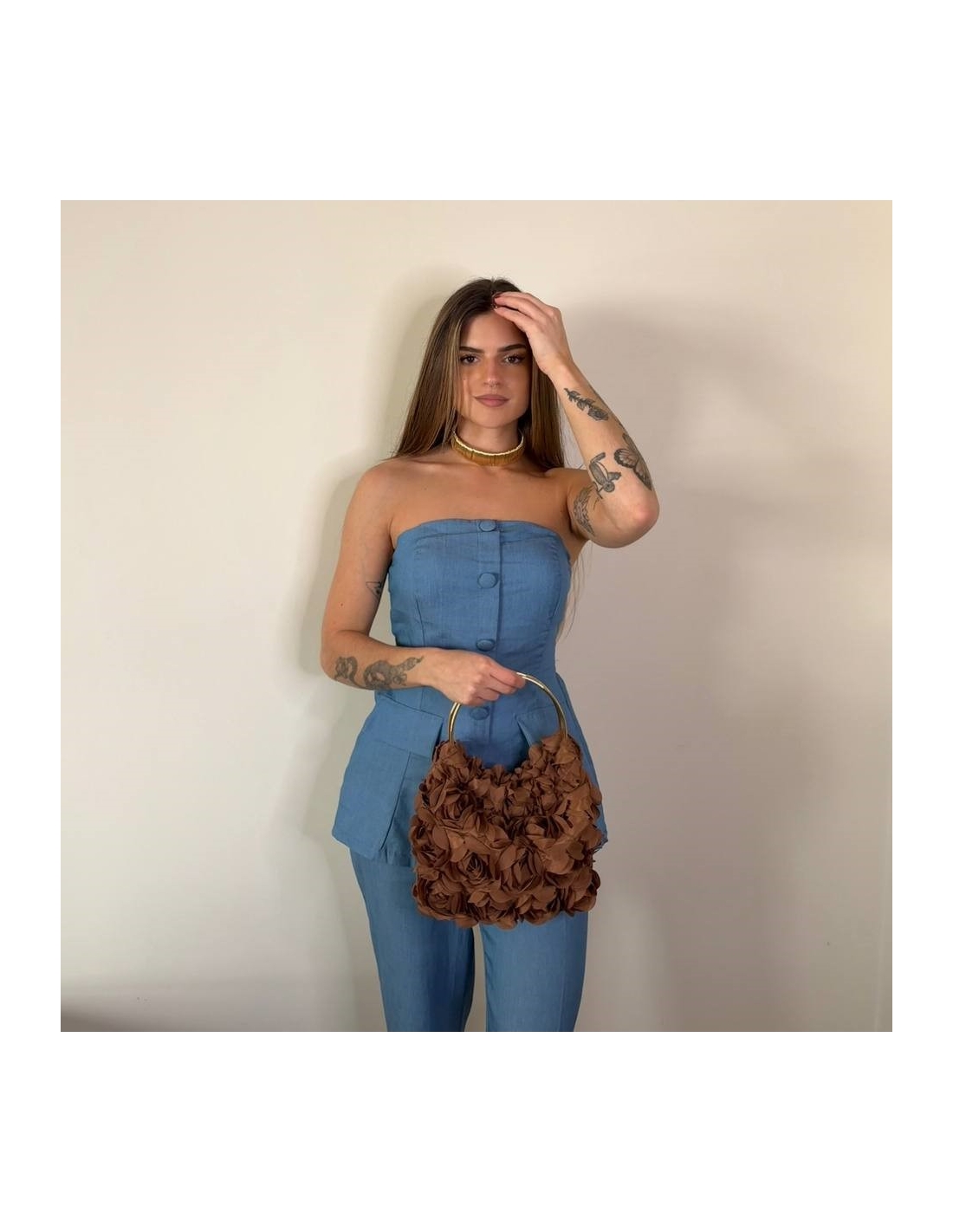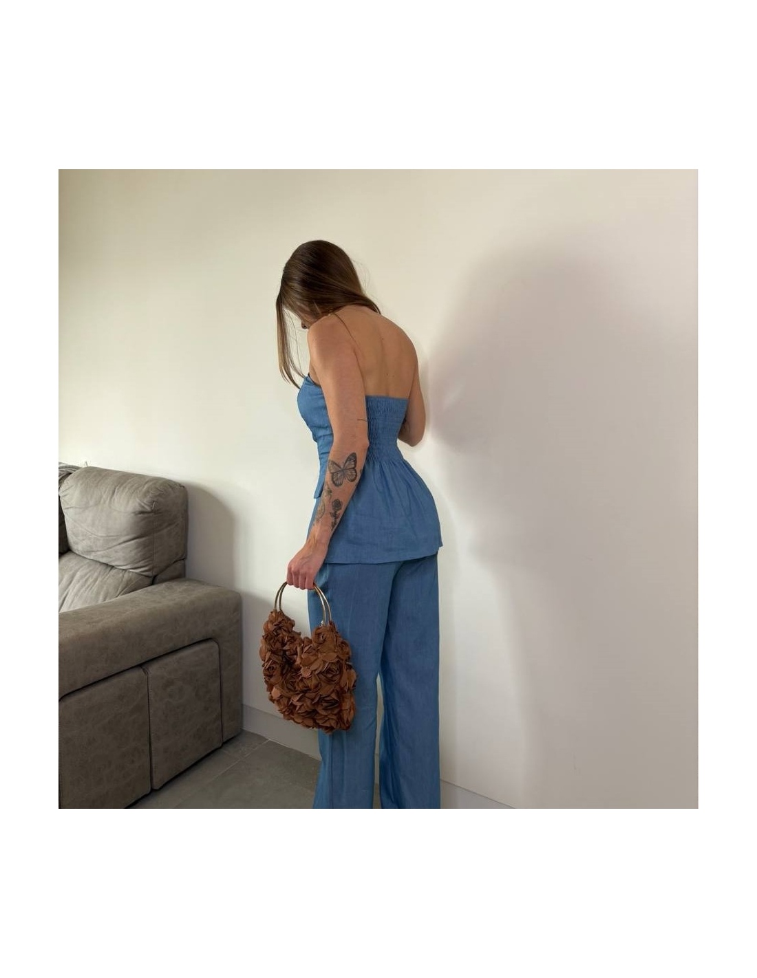 Conjunto de top más pantalón. Top de palabra de honor con falsos botones delanteros. Pantalón de tiro alto fluido. Con cintura elástica. Talla única