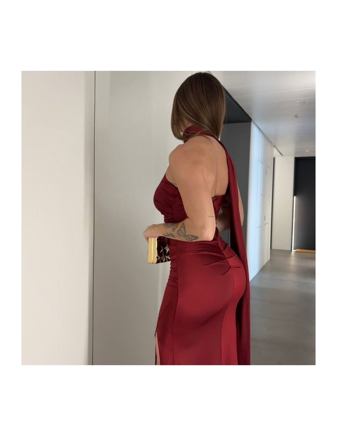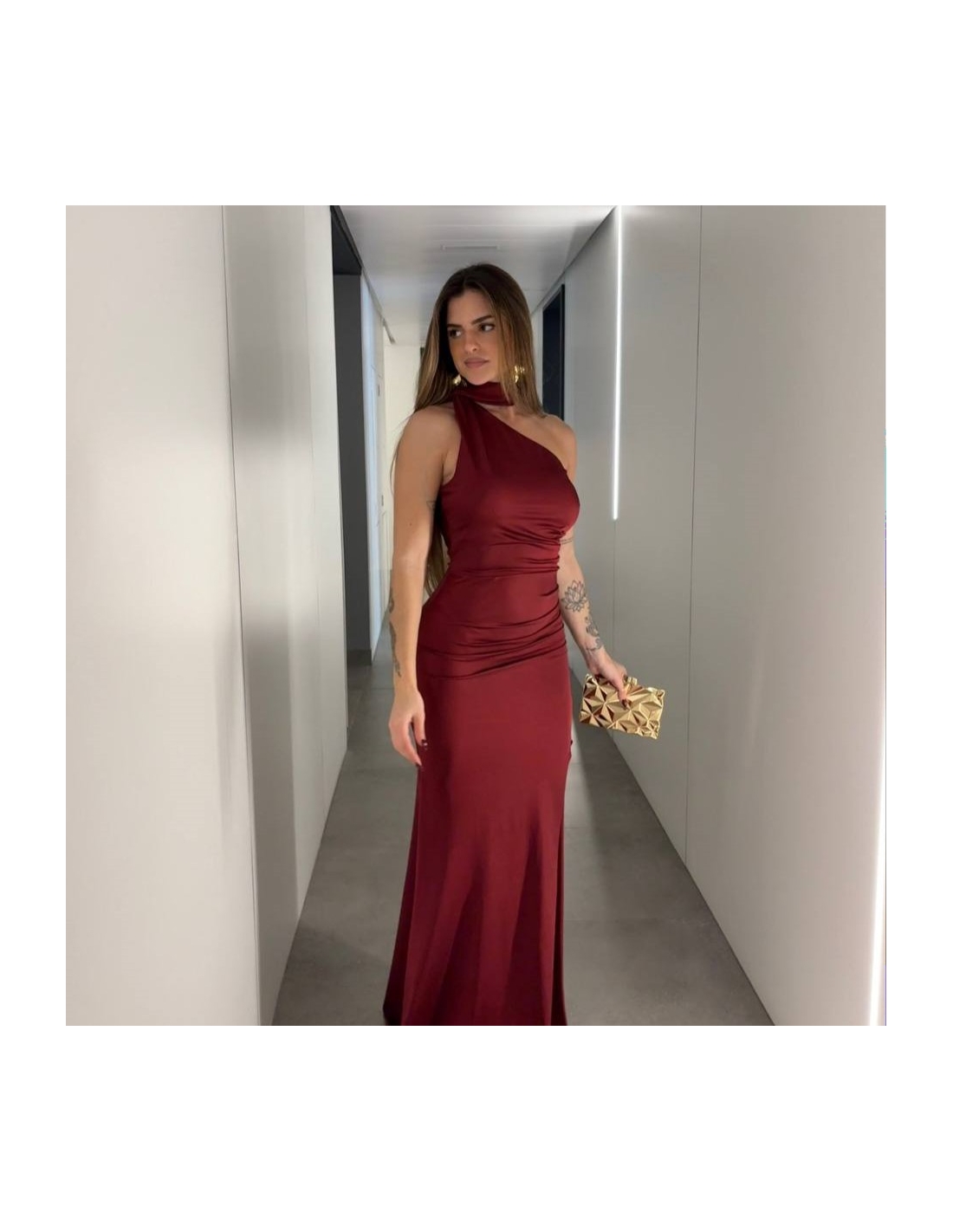 Vestido evento largo en tono vino. Con lazada a tono. Fruncido. Cierre trasero con cremallera oculta. Con casco incorporado en el pecho. Talla única