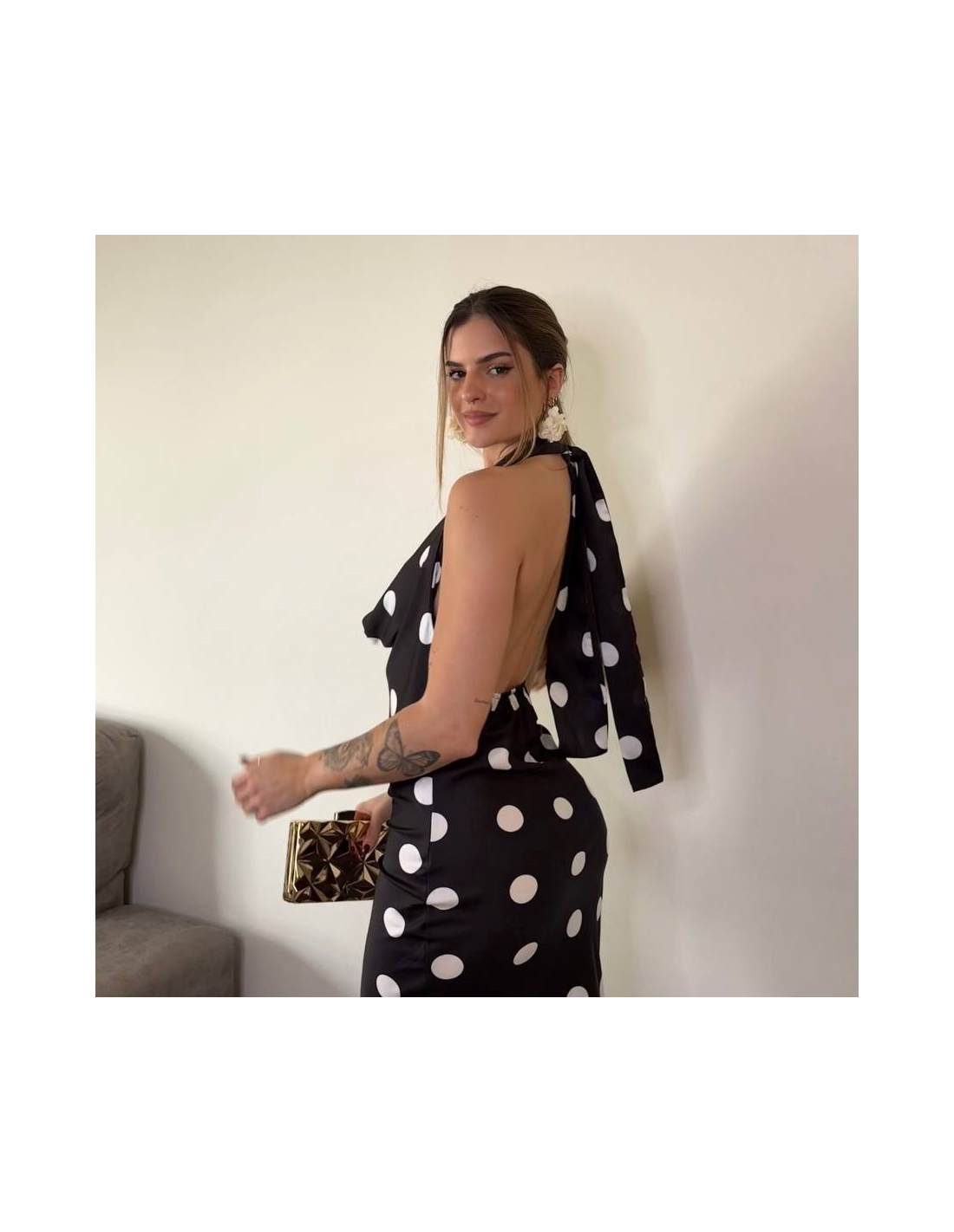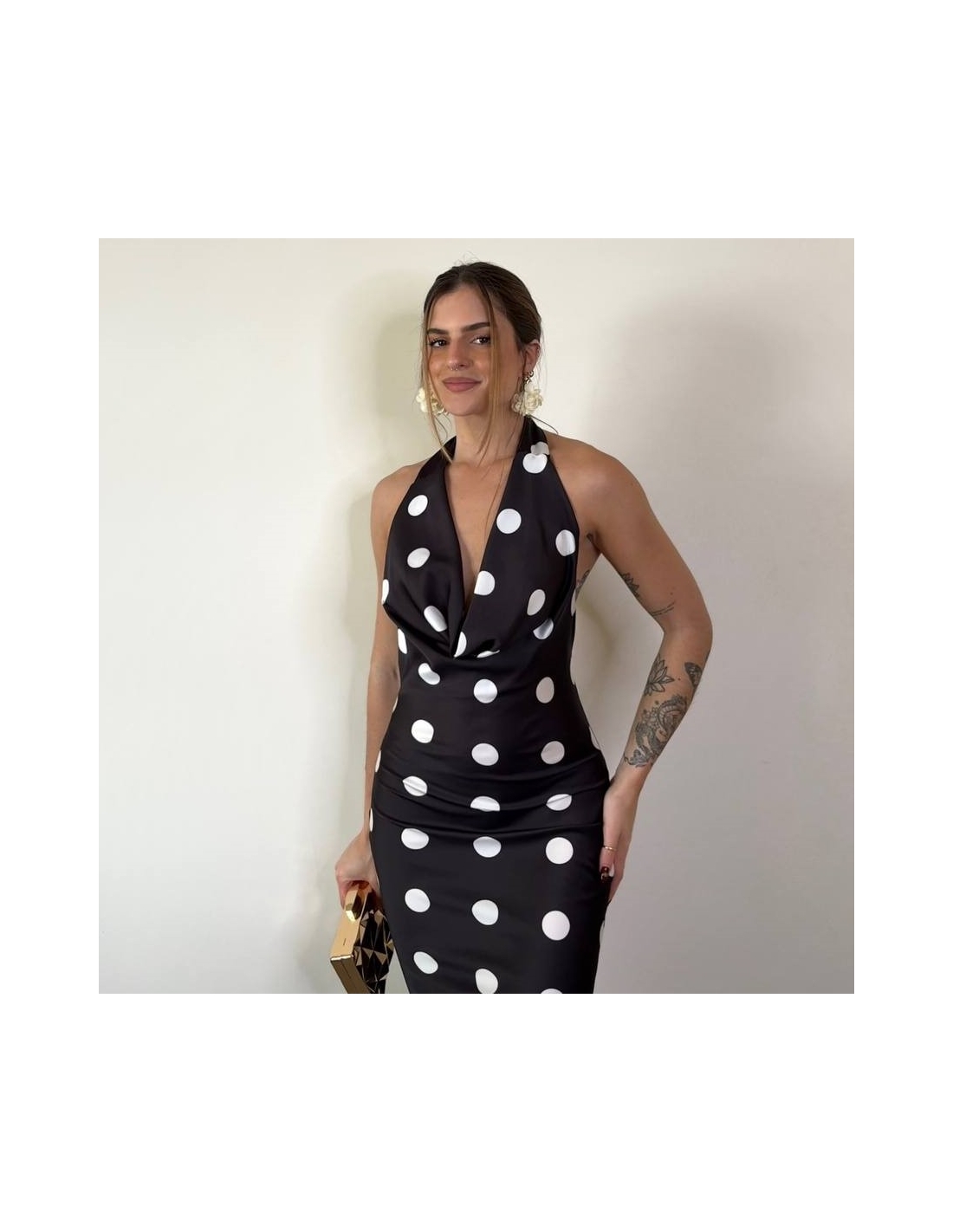 Vestido ajustado con estampado de lunares. Escote fluido. Regulable con lazada al cuello. Talla única