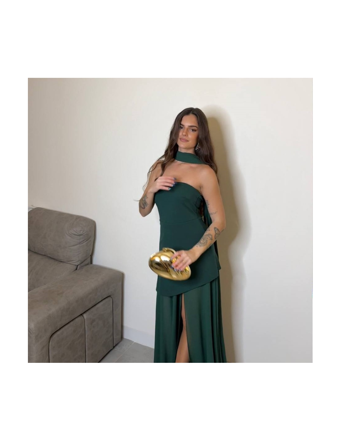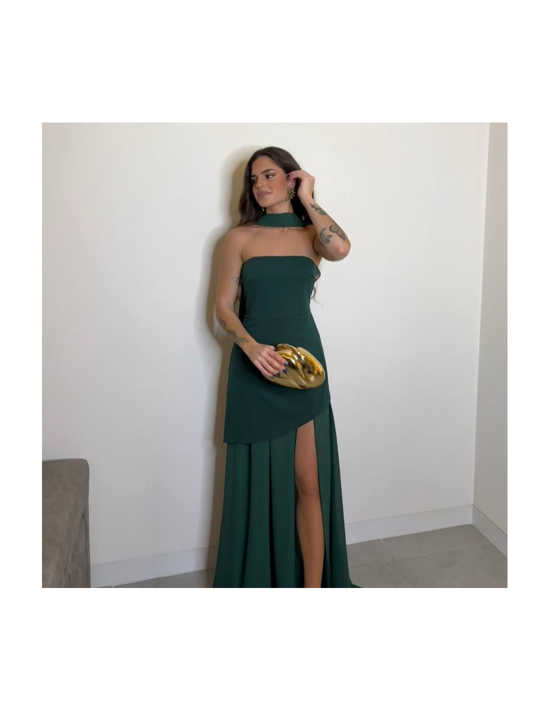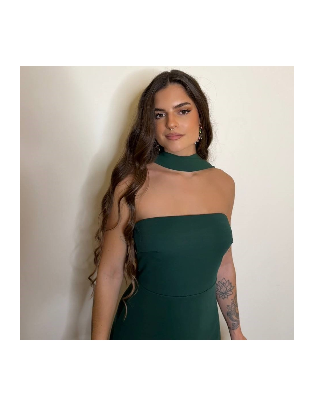 Vestido evento en tono verde botella. De palabra de honor. Con chal tul a tono. Gasa en bajo con abertura. Talla única