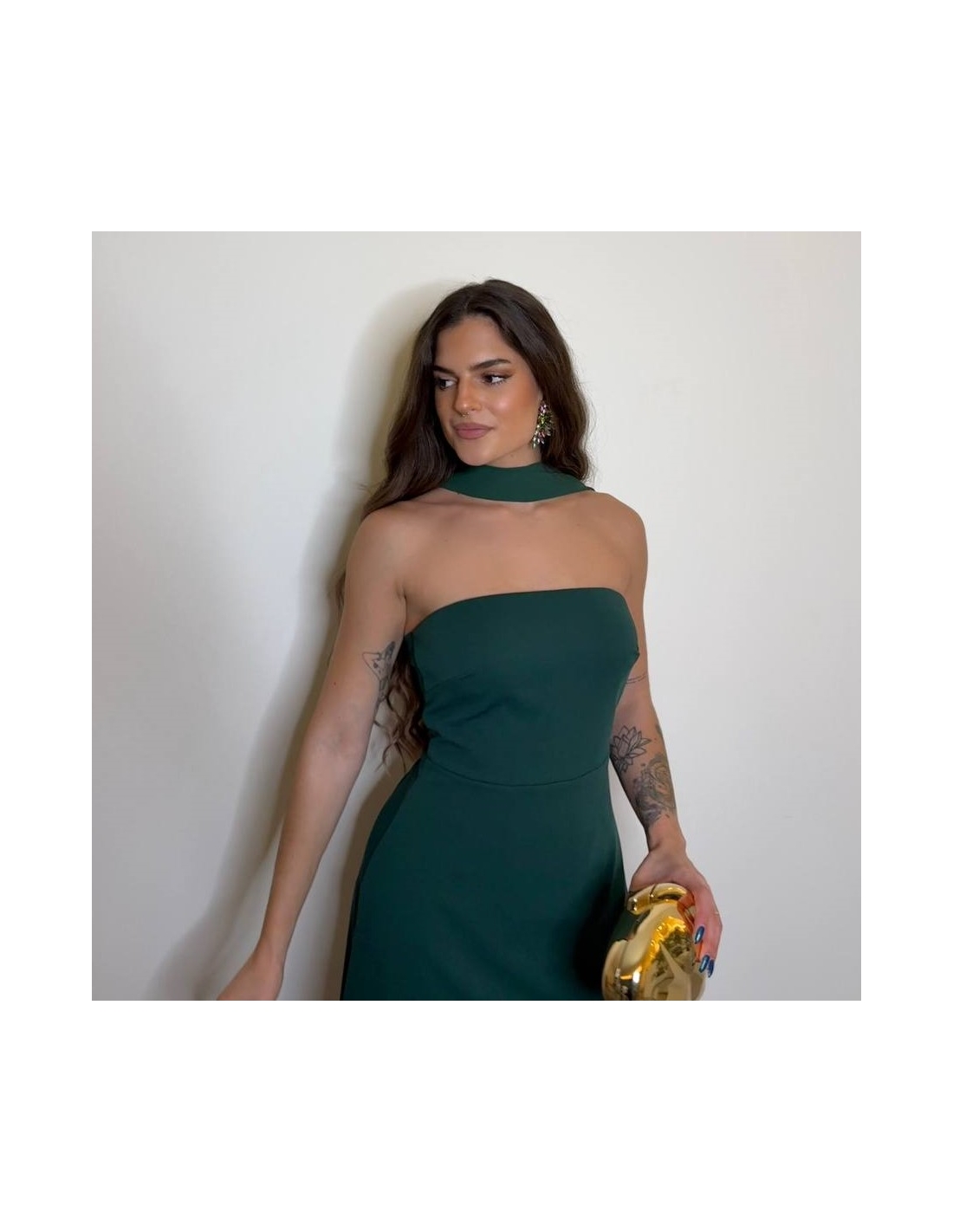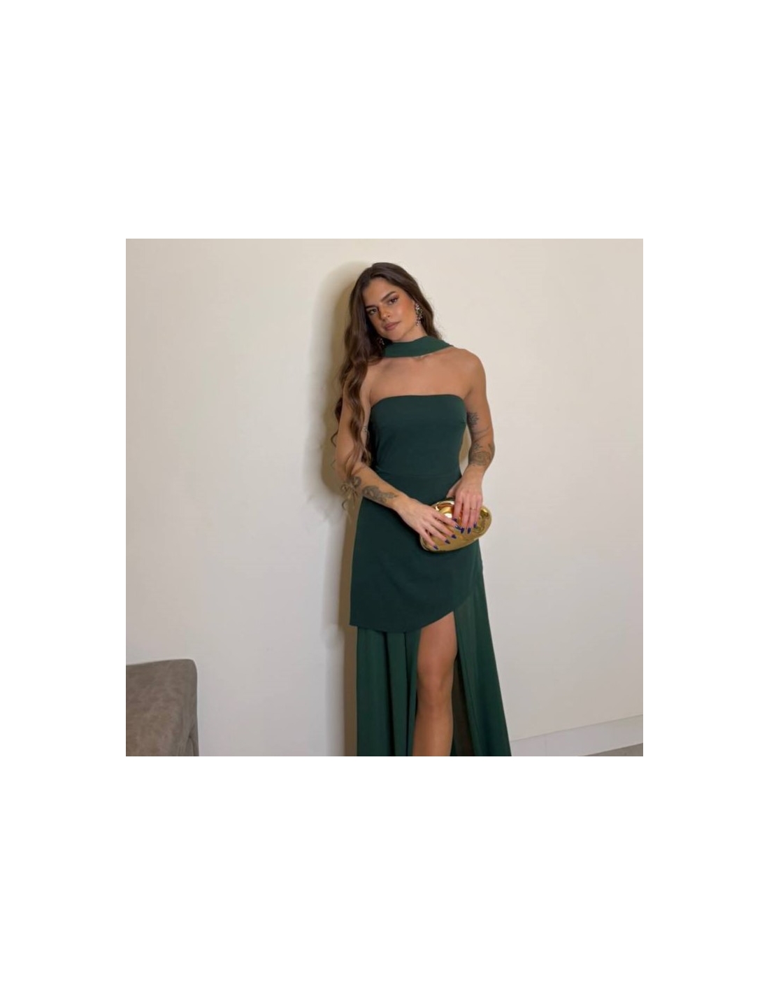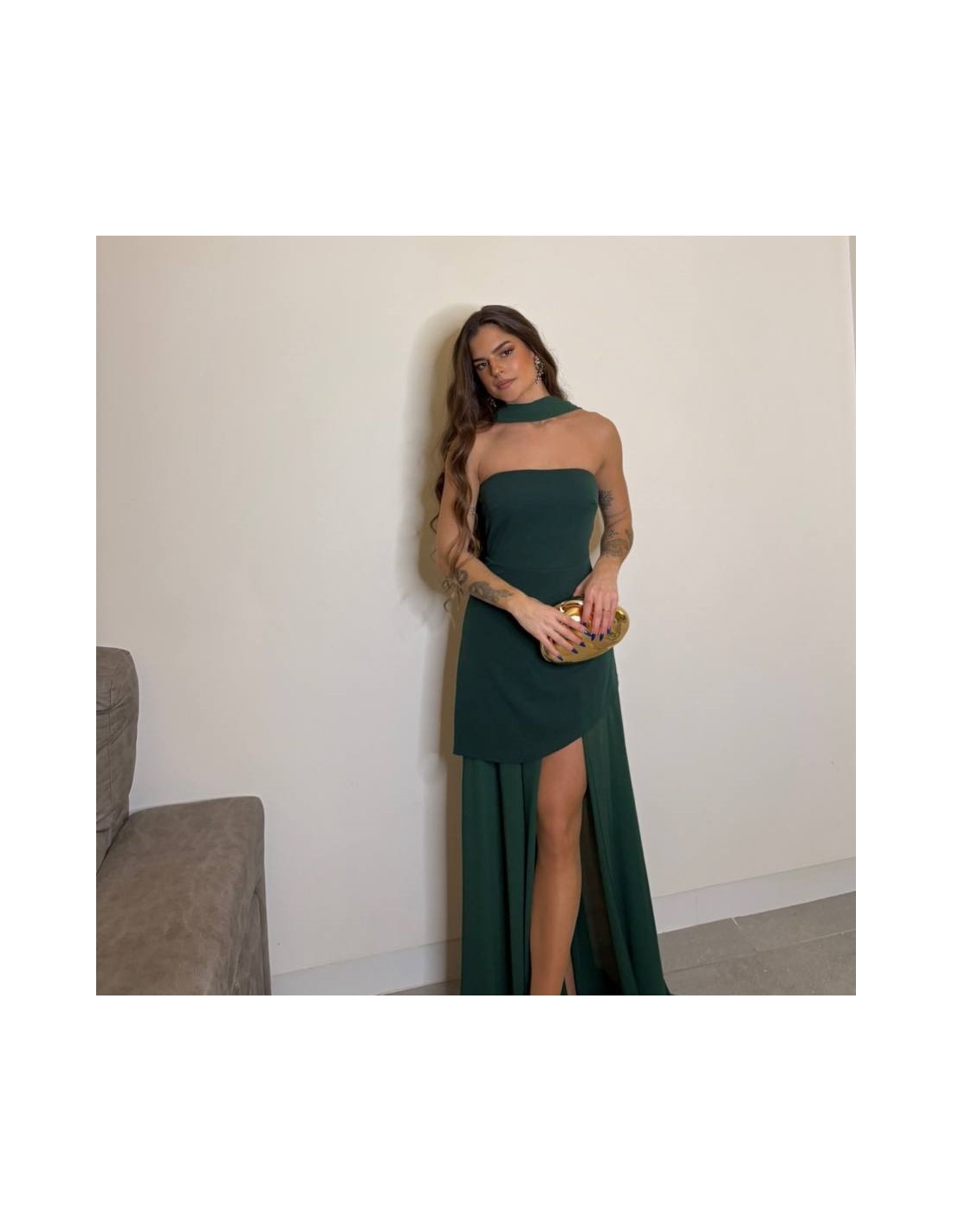 Vestido evento en tono verde botella. De palabra de honor. Con chal tul a tono. Gasa en bajo con abertura. Talla única